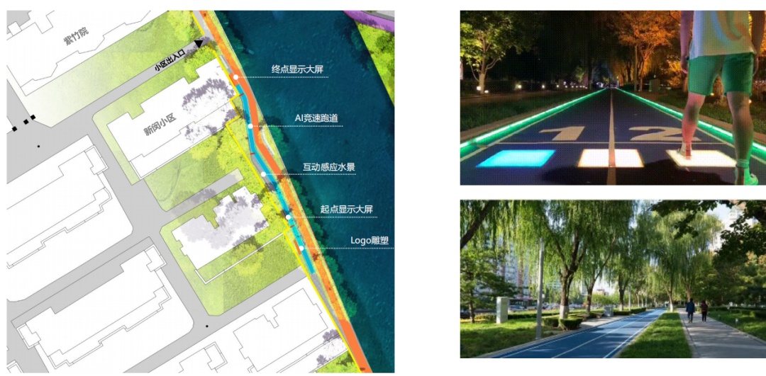 二是“大零号湾”科技元素的体现。拟打通东川路、江川路、新闵路三段桥下空间,将自然界的“光、风、声”元素融入到桥下昏暗的场地通道设计中。同时,设置滨水漫步和智能慢跑步道,伴随有智慧大屏、智能感应灯、AI竞速跑道等。