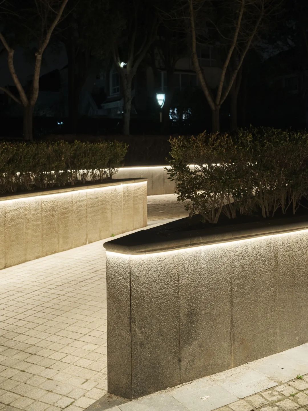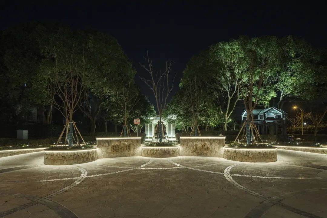 每个黄昏褪尽的夜晚,韩谊路的灯光便自然地融入到了景观之中。淡淡的灯光轻柔地洒在了走道上,应和着天空中微弱的月光,不仅赋满诗意,也给住宅区的居民提供了安静温和的游园环境。