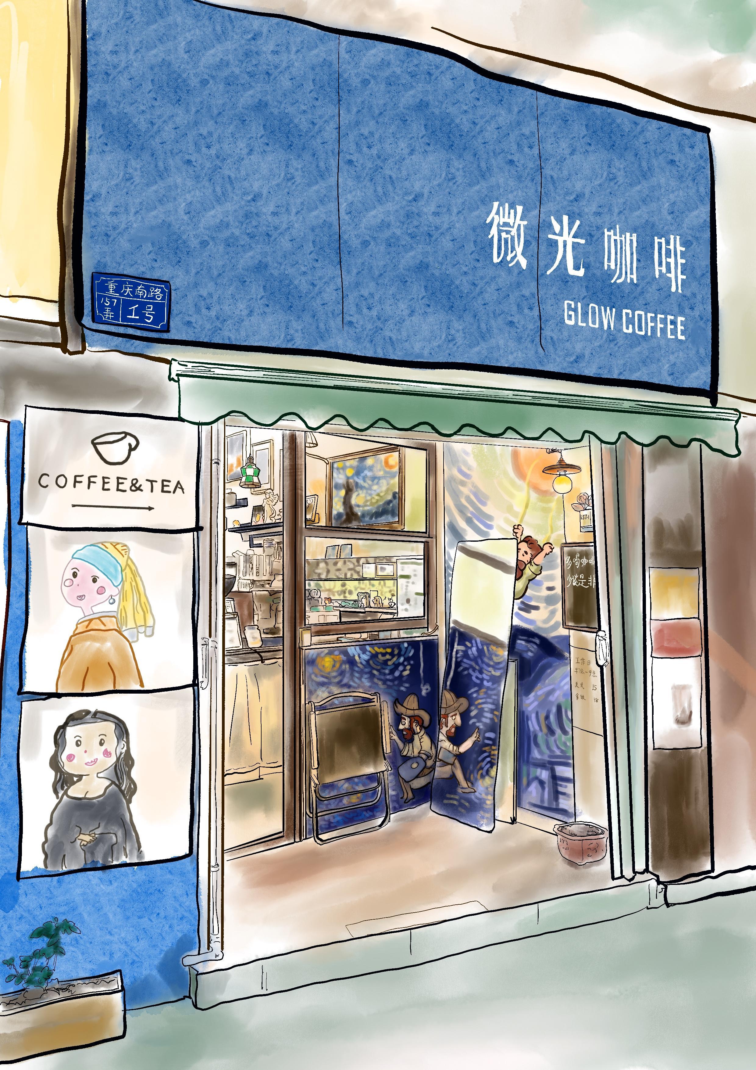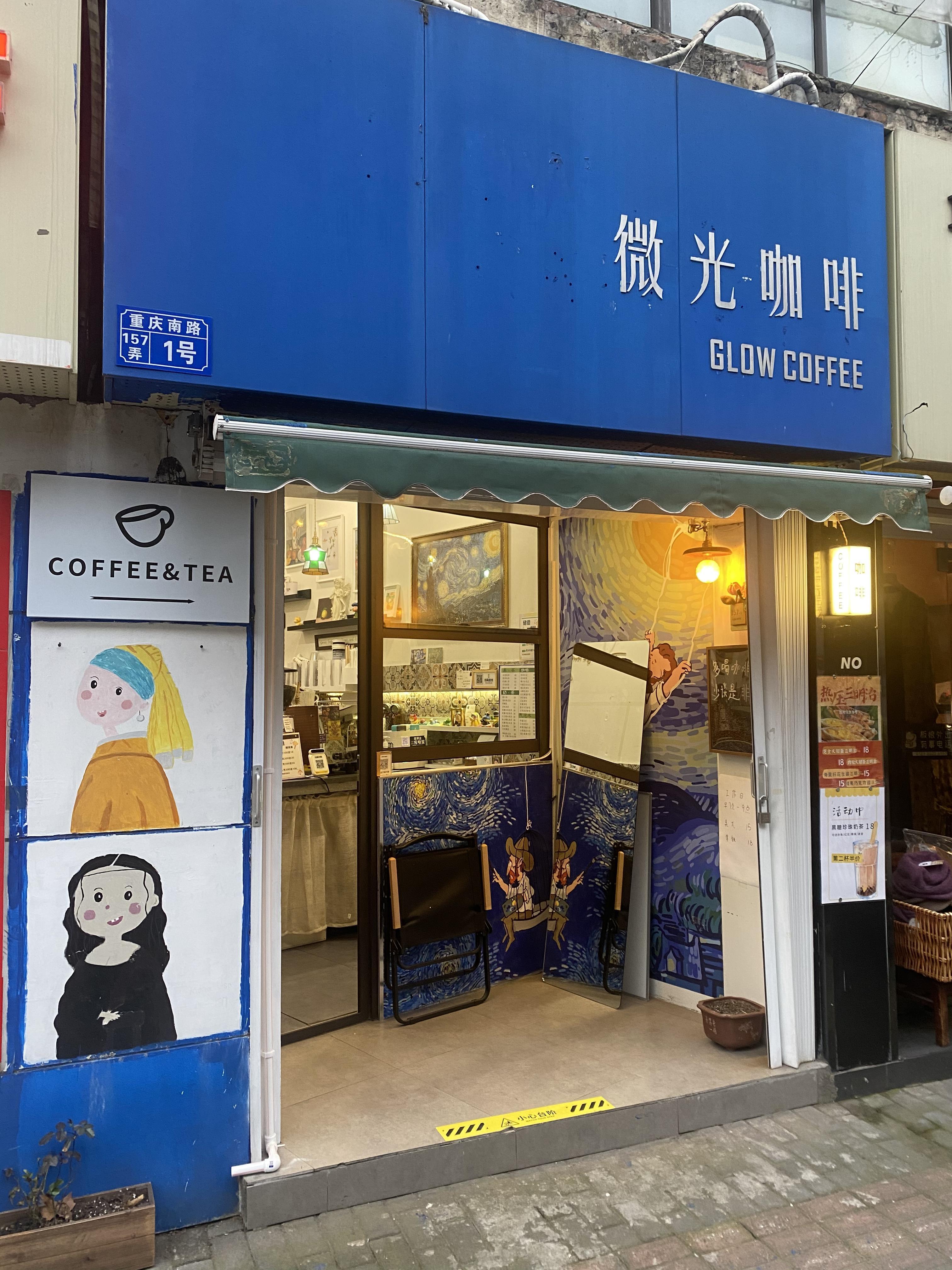“微光”咖啡,店如其名。和烛光一样的微小,却格外温馨。热爱艺术的店主,用心手绘着店里的每一片墙面,放上自己钟爱的画和各类摆设。坐在门口的椅子上喝着爽口的咖啡,焦躁的心也是可以被这样的小店治愈的。