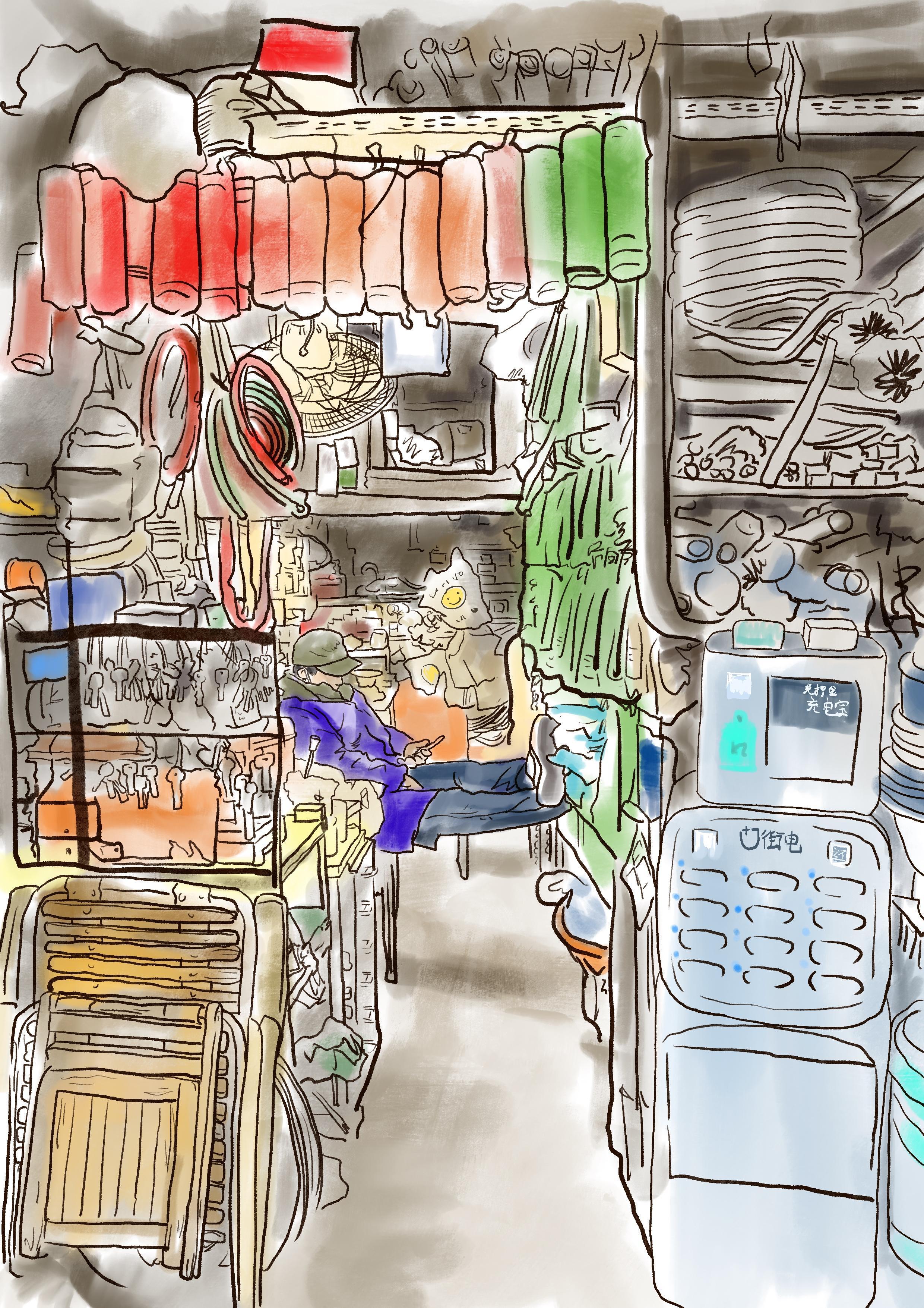 街边转角的五金店虽然看着又小又破,杂乱中却有着自己的规律。跷着腿的大爷忙里偷闲,沉浸在网络的海洋里。