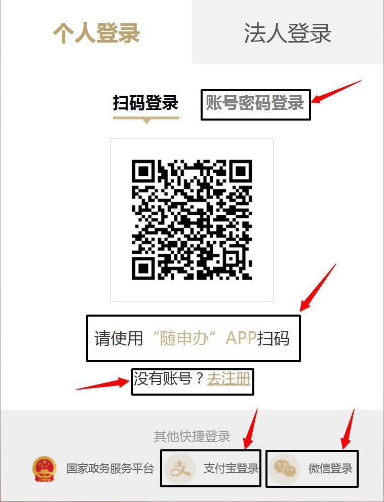 (5)进行“一网通办”的登录操作,可打开“随身办市民云”APP扫码登入,或输入账号密码登录,或点击微信、支付宝后扫码登录,新用户点击“去注册”。