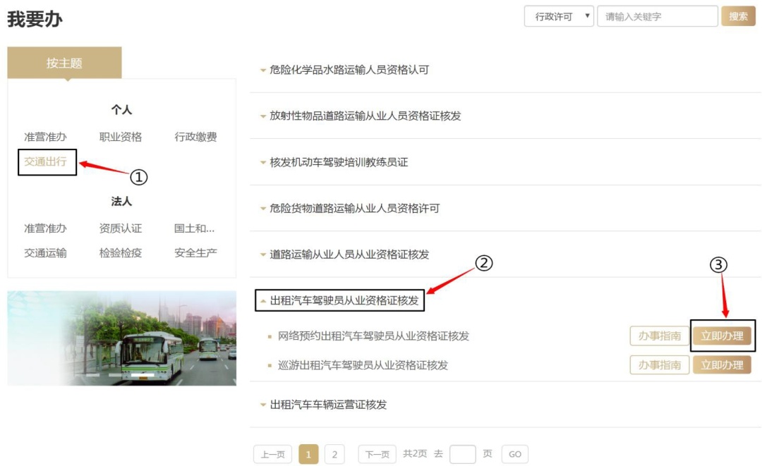 (3)点击“交通出行”主题下“出租汽车驾驶员从业资格证核发”选项,选择“立即办理”。