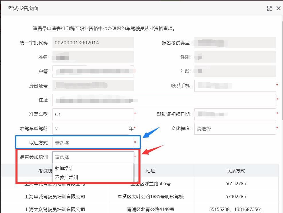 (3)网约车从业资格报名时可自愿选择是否参加考前培训。如参加培训,请在报名后尽快前往线下办理点进行培训报名 (费用问题请咨询办理点),培训点将安排具体考试时间。若不参加培训,后续将以短信告知具体考试时间,在获悉考试时间后返回本页面打印考试通知单。