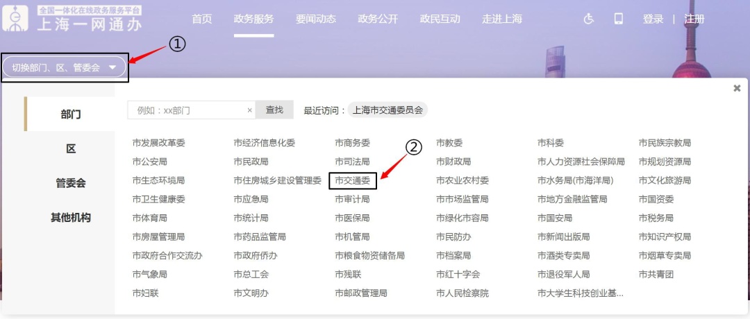 (2)按顺序选择“切换部门、区、管委会”页面下“市交通委”。