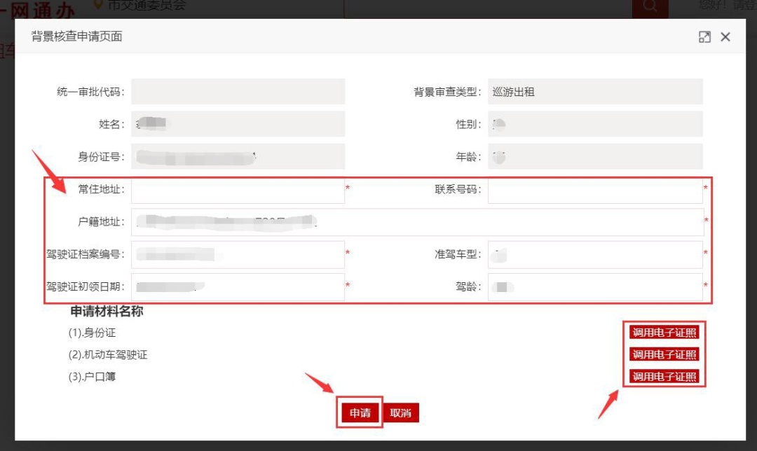 (3)进入背景核查申请页面,填写相关申请信息,获取或手动上传申请材料,点击“申请”。