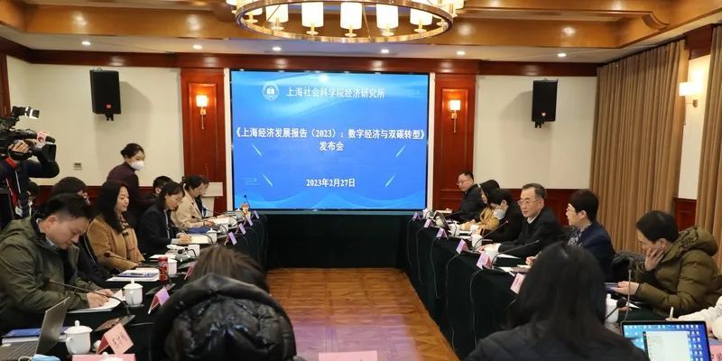 2月27日,《上海经济发展报告(2023):数字经济与双碳转型》发布会在上海社会科学院举行。这份又被称作“上海经济蓝皮书(2023)”的报告,对2022-2023年上海宏观经济形势进行了分析,指出全球经济增长将明显放缓,但中国仍是世界经济的发动机。报告重点聚焦数字经济与双碳转型,着力挖掘数字经济和双碳战略所蕴藏的技术革新和产业机遇,并就积极推动数字经济和绿色低碳相关产业的发展提出建议。上海社会科学院党委书记权衡研究员致辞。