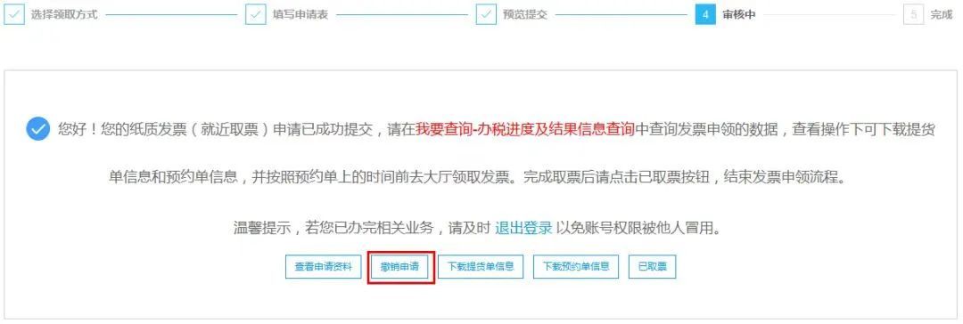 7.若信息填写有误,需撤销本次领票申请,可点击【取销申请】按钮,撤销后,预约单也将同步撤销。