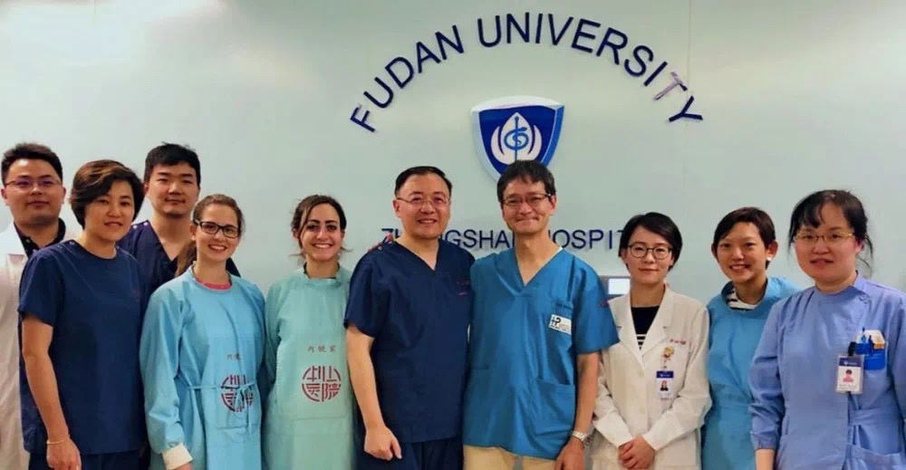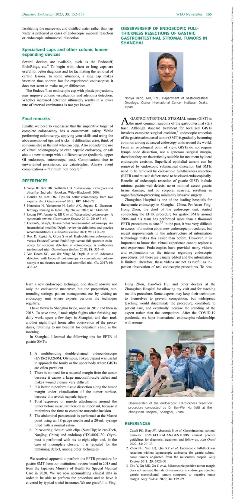 今年一月,著名消化内镜杂志Digestive Endoscopy上刊登了日本大阪国际癌中心的上堂文也(Noriya Uedo)教授发表的一篇Newsletter,上堂教授在文中提到了他2017年、2018年两次来中山医院学习内镜切除胃黏膜下肿瘤及其缝合技术的经历,并分享了几点经验和收获。上堂教授认为,即使在现代互联网技术发达、信息获取渠道多样的情况下,任何虚拟体验如手术录像和图文阐述等,都无法替代亲身实践。于是在著名日本内镜大师八尾建史教授的推荐下,上堂教授及其团队来到复旦大学附属中山医院内镜中心参观学习,之后回到日本积极实践并推广该技术,并在日本第一届内镜全层切除及缝合技术研究会上讲述了他取得的进展和在中山医院学习期间的经历,此次会议产生了深远的影响。