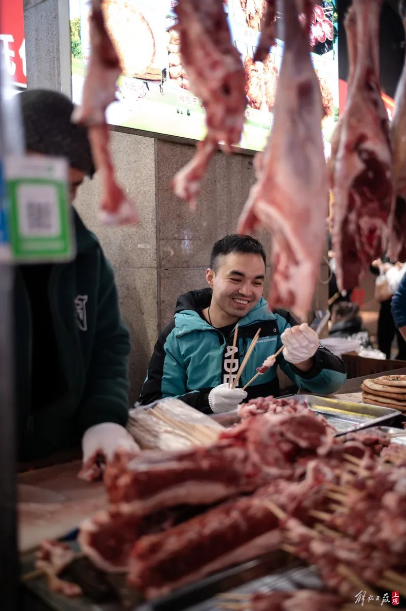 羊肉悬吊在摊位上,现切、现穿、现烤,新鲜看得见,大叔、小哥吆喝起来有着一股难以抵挡的热情。