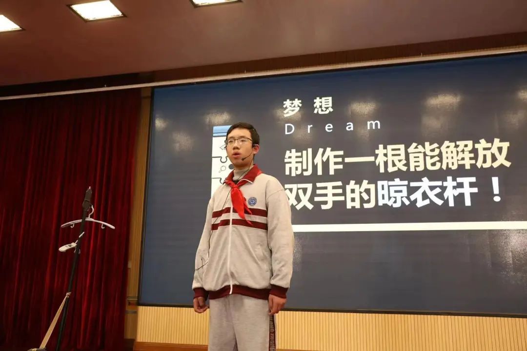 荣获了2022学年“启迪”科技创新奖特色奖的学生代表王远博,在“小年纪也能有大梦想”中讲述自己为了减轻奶奶的家务负担,运用科学知识设计了“智能晾衣杆”的暖心小故事;
