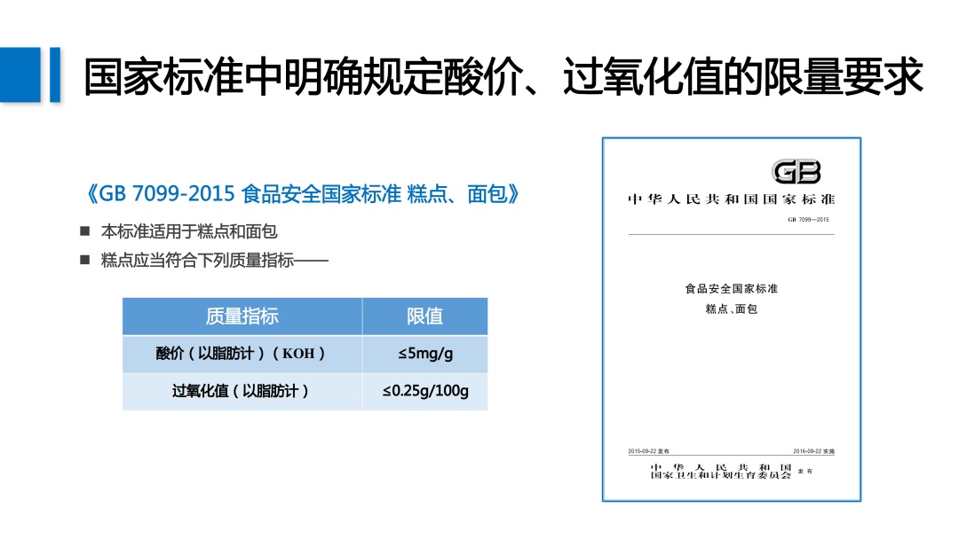 目前我国的食品标准中对添加油脂的产品规定了酸价和过氧化值的限量要求。以糕点为例,酸价的限值为≤5mg/g,过氧化值的限值为≤0.25g/100g。