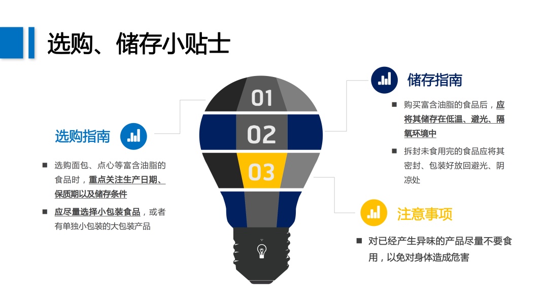 我们在选购时要尽量选择小包装食品,注意生产日期、保质期和储存条件,并按要求低温、避光、隔氧保存。