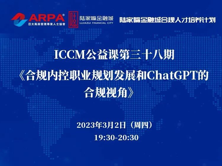 为助力上海市银行业合规示范区的建设,提升陆家嘴区域内专业化人才集聚度,接轨国际合规标准,强化金融机构合规意识,陆家嘴金融城与亚太风险管理专业人士协会(ARPA)共同推出“陆家嘴金融城合规人才培养计划-ICCM公益课”,第三十八期公益课围绕《合规内控职业规划发展和ChatGPT的合规视角》主题进行分享。课程以在线课程形式开展,扫描下文中的二维码进入房间,即可免费听课。
