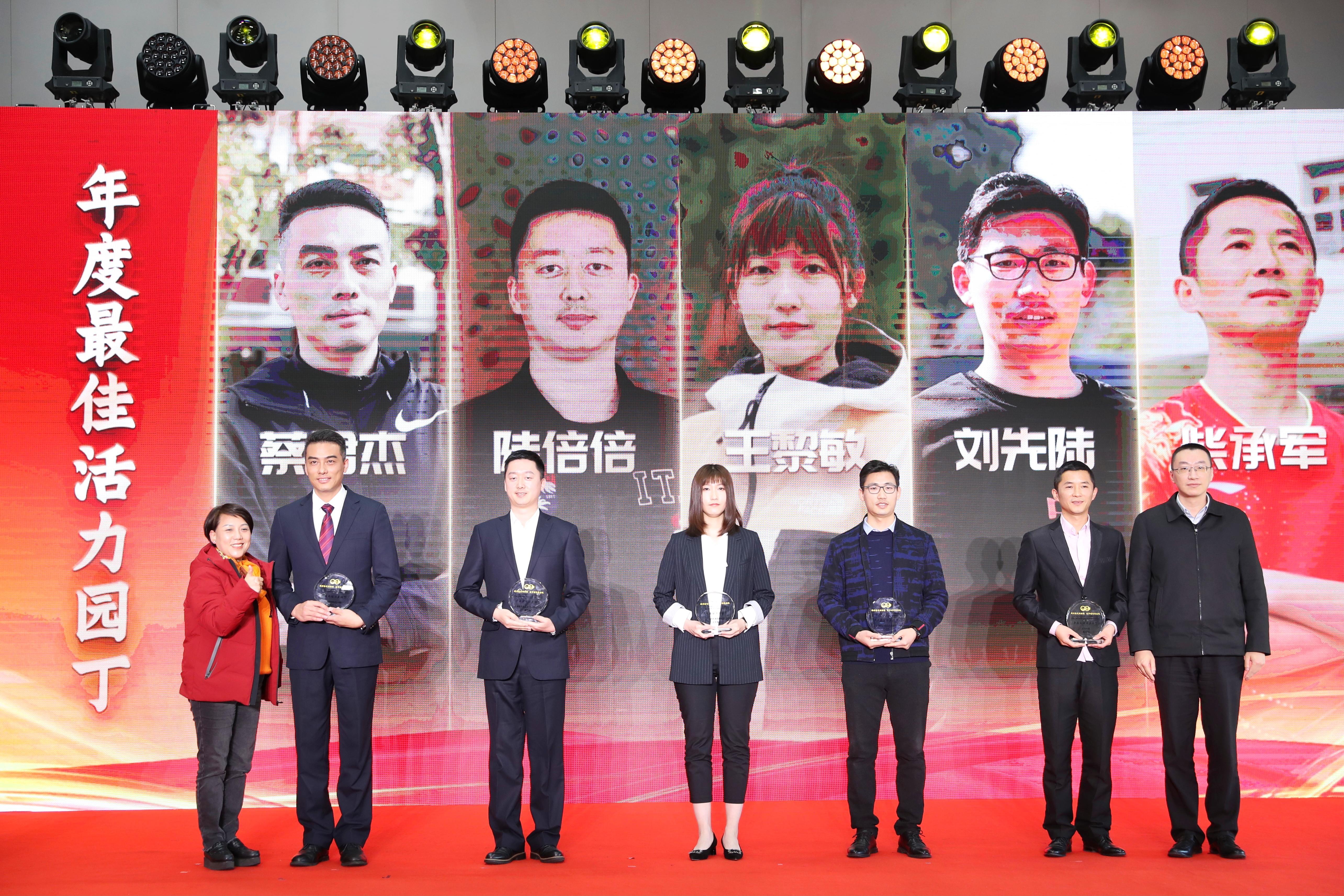 市体育局副局长宋慧和团市委副书记徐豪为陆倍倍(左三)等五位老师颁发“年度最佳活力园丁”奖
