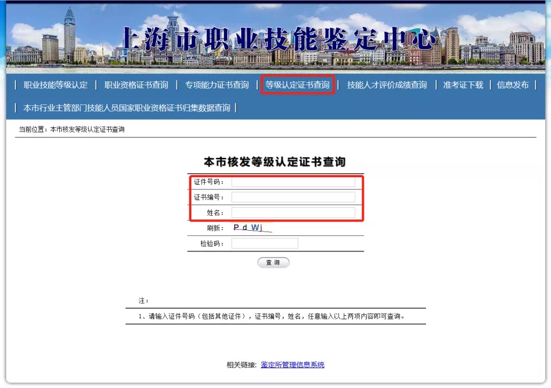 通过上海市人力资源和社会保障局官网(http://rsj.sh.gov.cn)底部“特色专栏”的“上海市职业技能鉴定”相关栏目进行查询。或者直接登录网址:(http://www.rsj.sh.gov.cn/xjd/index600.jsp)