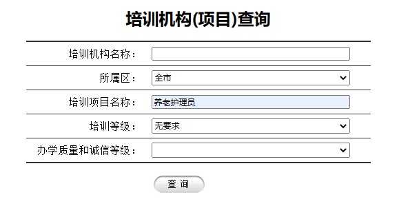 或者直接登录网址 (http://www.rsj.sh.gov.cn/sbsjb/zypx/pages/pxjgcx.jsp),在查询页,培训项目名称输入“养老护理员”即可查询。