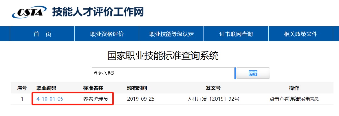2、满足养老护理员相应等级的申报条件。可通过技能人才评价工作网(http://www.osta.org.cn/index.html)中“职业标准系统”,在上方搜索框输入“养老护理员”或“4-10-01-05”查询。或者直接登录网址:(http://biaozhun.osta.org.cn/pdfview.html?code=182)