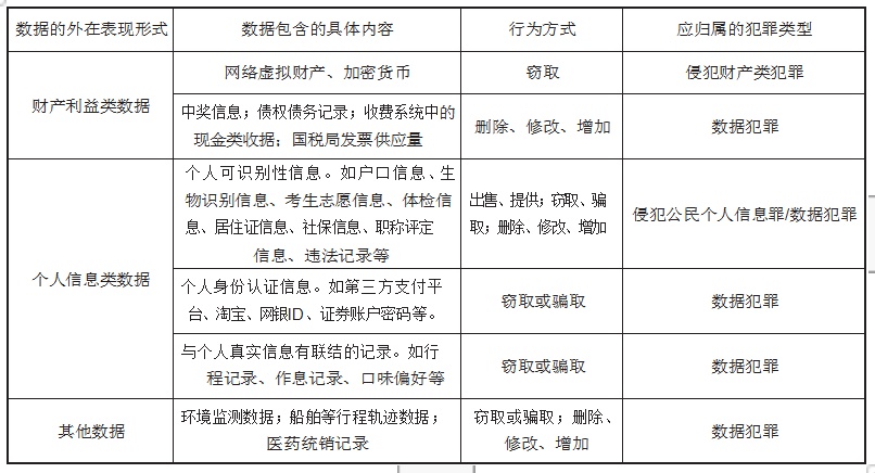 根据数据所承载信息的特征不同,可以将数据大致分为财产利益类数据、个人信息类数据与其他数据三类。唯有其他数据可以全部归属于数据犯罪,其余两类部分可被侵犯财产罪和侵犯公民个人信息罪所涵摄,应根据具体案件事实予以区分。
