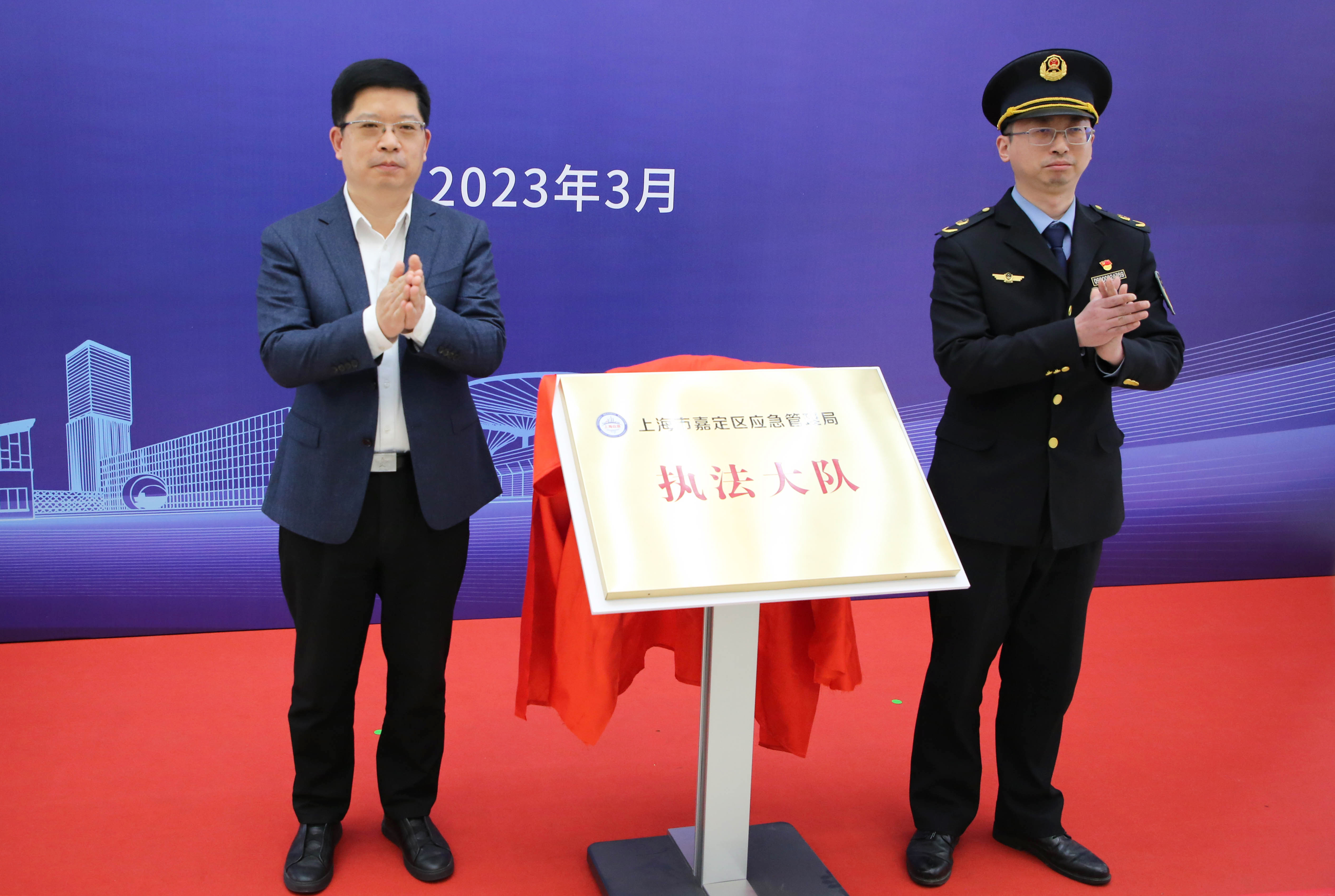 区委常委、副区长朱效洁和上海市应急局执法总队总队长张之崟共同为嘉定区应急管理局执法大队揭牌。