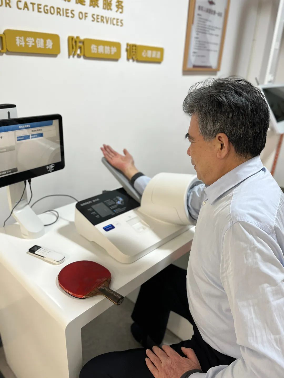 一位家住附近的70岁老人平日里喜欢到长者运动健康之家旁边的场地打乒乓球,打完球后他来到健康之家,测量自己的血压,进行一些补充锻炼,最后躺在垂直律动沙发上感慨:“做做锻炼,再用这个东西促进下循环,蛮好!”