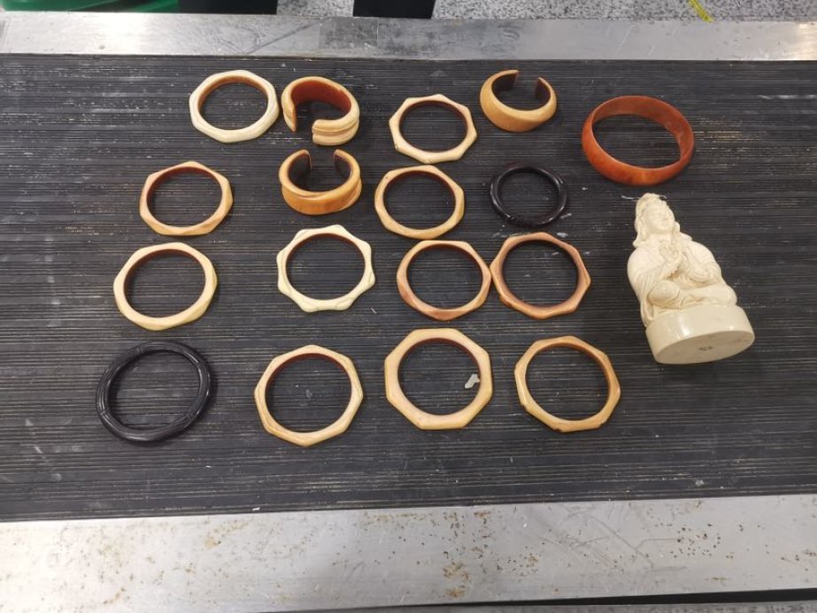 近日,上海浦东国际机场海关查获一名旅客违规携带18件象牙制品,包括1件牙雕菩萨像塑、1件玛瑙色手镯、2件黑色手镯、11件木色手镯、3件白色手镯,共计1千克。目前该案线索已移交至缉私部门作进一步处理。