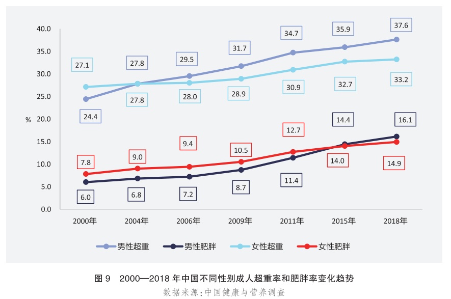 目前我国6岁以下和6-17岁儿童青少年超重肥胖率分别达到10.4%和19.0%,18岁及以上居民超重率和肥胖率分别为34.3%和16.4%,成年人超重或肥胖已经超过一半(50.7%)。年成人超重和肥胖率快速上升,农村人群增幅更快。