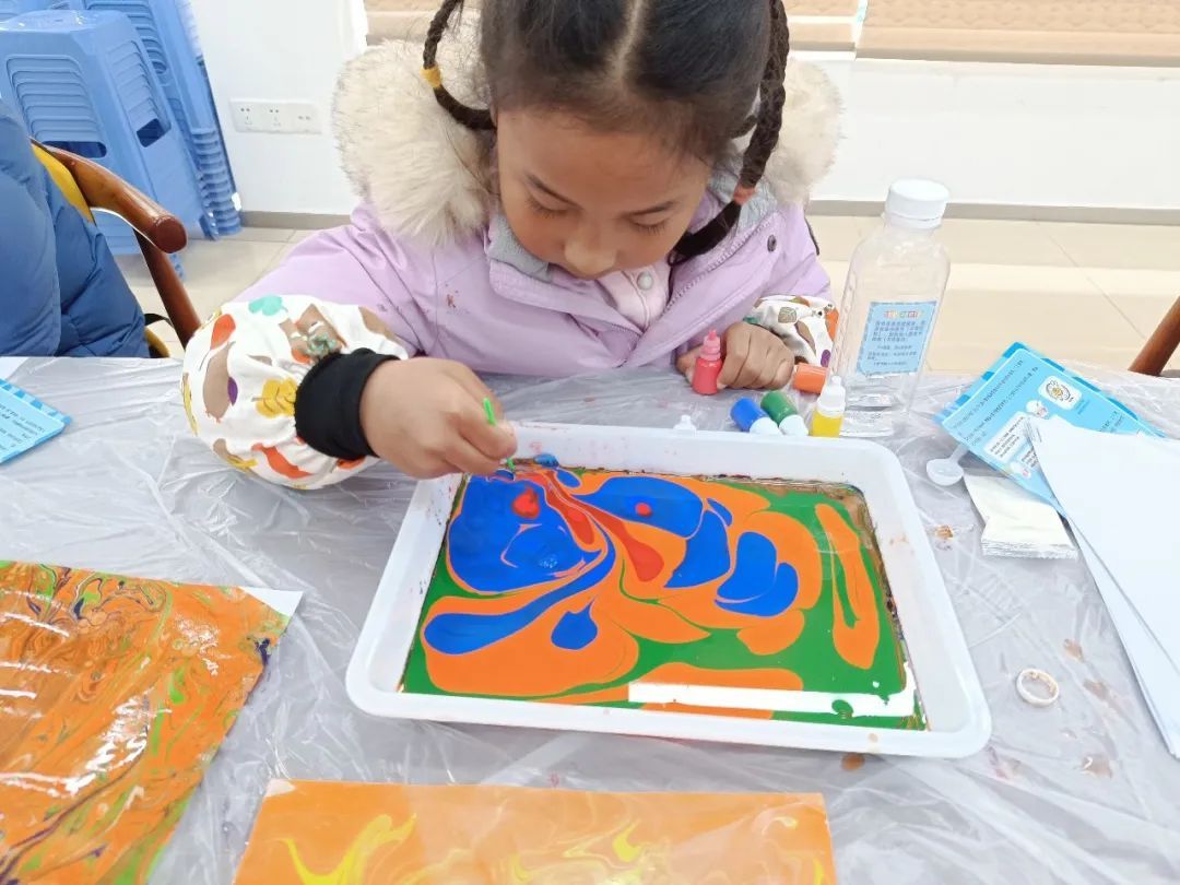 在老师的指导下,孩子们通过动手实践,探寻水拓画的特别之处。孩子们的无限创意总让人意想不到,有的绘制出一幅幅梦幻星空,有的画出了心中最美的花。