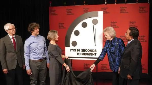 当地时间2023年1月24日,美国《原子科学家公报》杂志的科学家小组在华盛顿国家新闻俱乐部新闻发布会上宣布,将“末日之钟”拨快10秒,距离象征“世界末日的午夜”仅剩90秒。