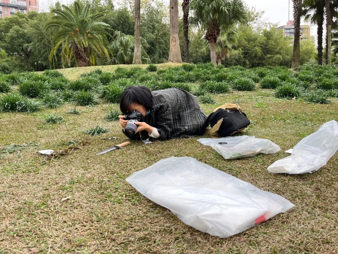 工作人员在上海植物园草坪上拍摄