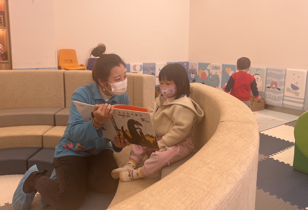 二岁半的小女孩陈子朦开心地从蓝绿色的滑滑梯上滑下,另一个小男孩看见了也欢快地跑过来和她一起滑。不一会,她又走到绘本阅读区,拿起一本好奇地翻阅起来。一旁仔细观察的老师看见了立马走过来,蹲下去温柔地读给她听。陈子朦很快端坐在沙发上盯着图画,沉浸到美妙的故事里去了……当天,小区里有十几个小朋友光临此间“宝宝屋”玩耍学习。