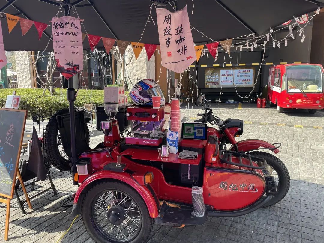 在市集里,除了特色美食和创意手作外,一辆改装机车也吸引了不少年轻人的关注。原来,“骑纪中国”将炫酷的改装咖啡机车首次搬到上海街头,以“用故事换咖啡”的形式,让大家与之分享各自的故事。