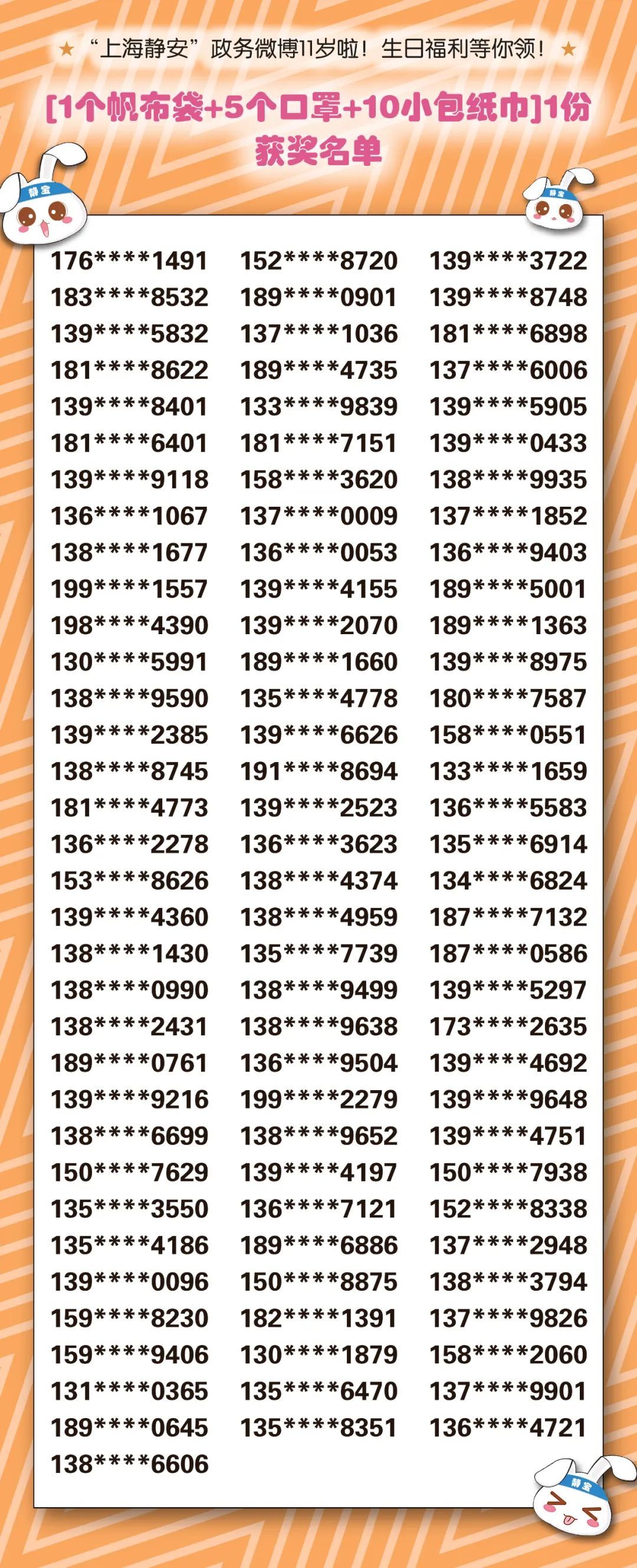 此前静宝推送的《“上海静安”政务微博11岁啦!生日福利等你领!》中奖名单已经出炉!详见↓