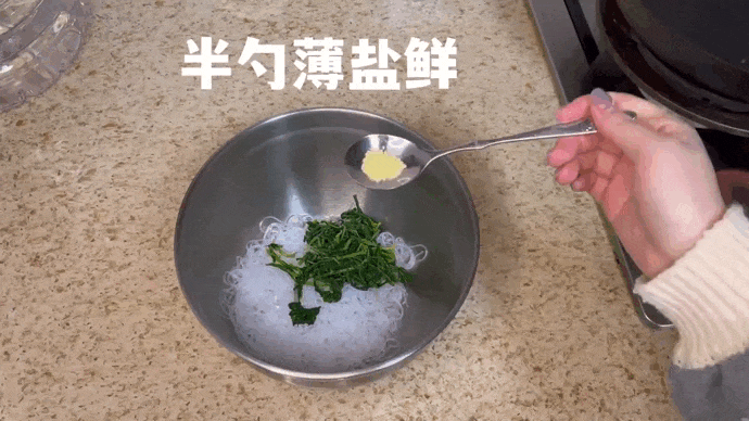 水开后加入一勺盐,放入粉丝煮熟后捞出,过凉水备用。