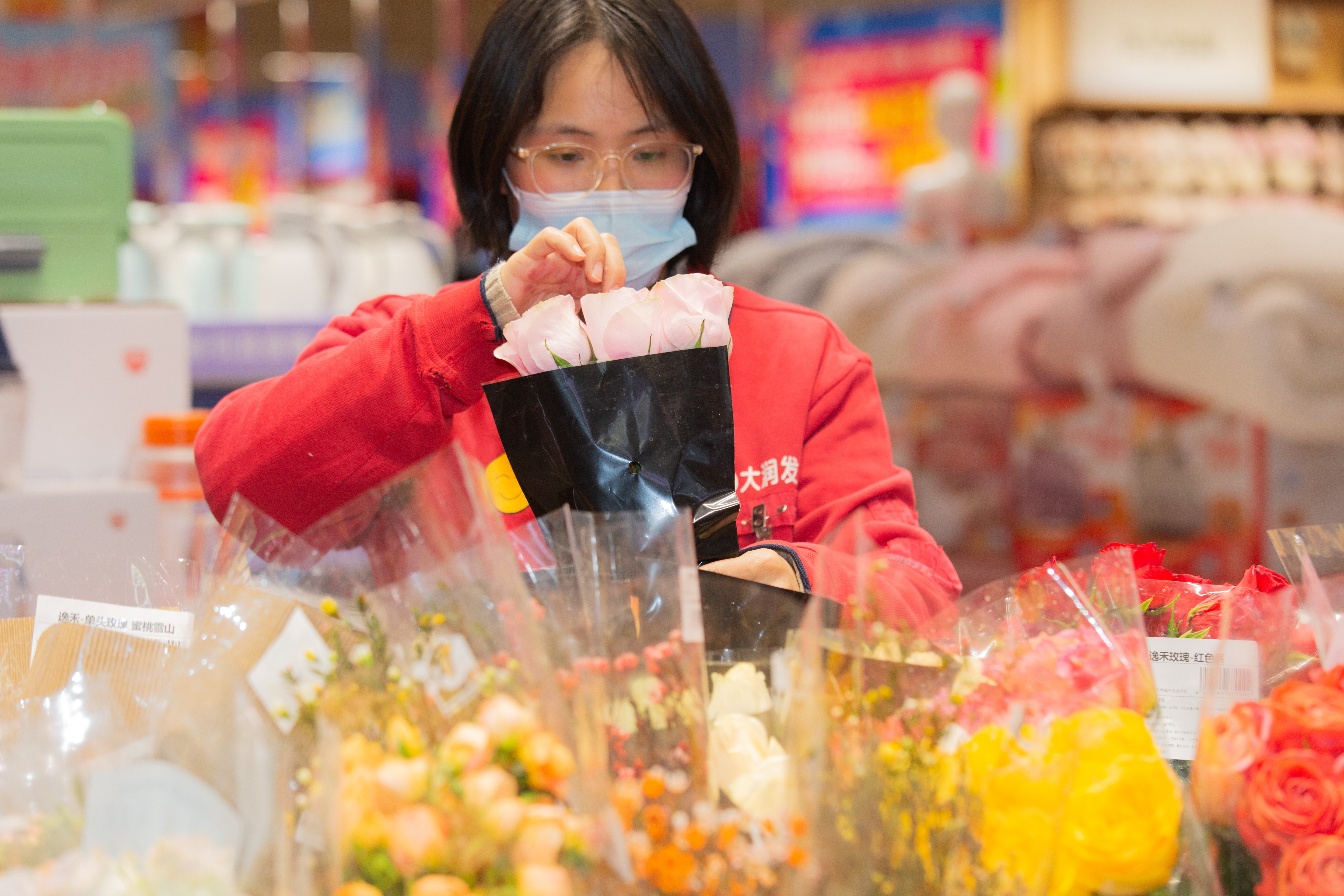 “我们发现,女性顾客来大润发买菜的时候都会带一束鲜花回家。”大润发鲜花采购经理张晓钦告诉记者,越来越多的女性为自己买花,鲜花也正从礼物变成生活用品,今年三八节限时更名“大润花”,也寓意着“每一个她都是一朵花,生活可以有很多新花样。”