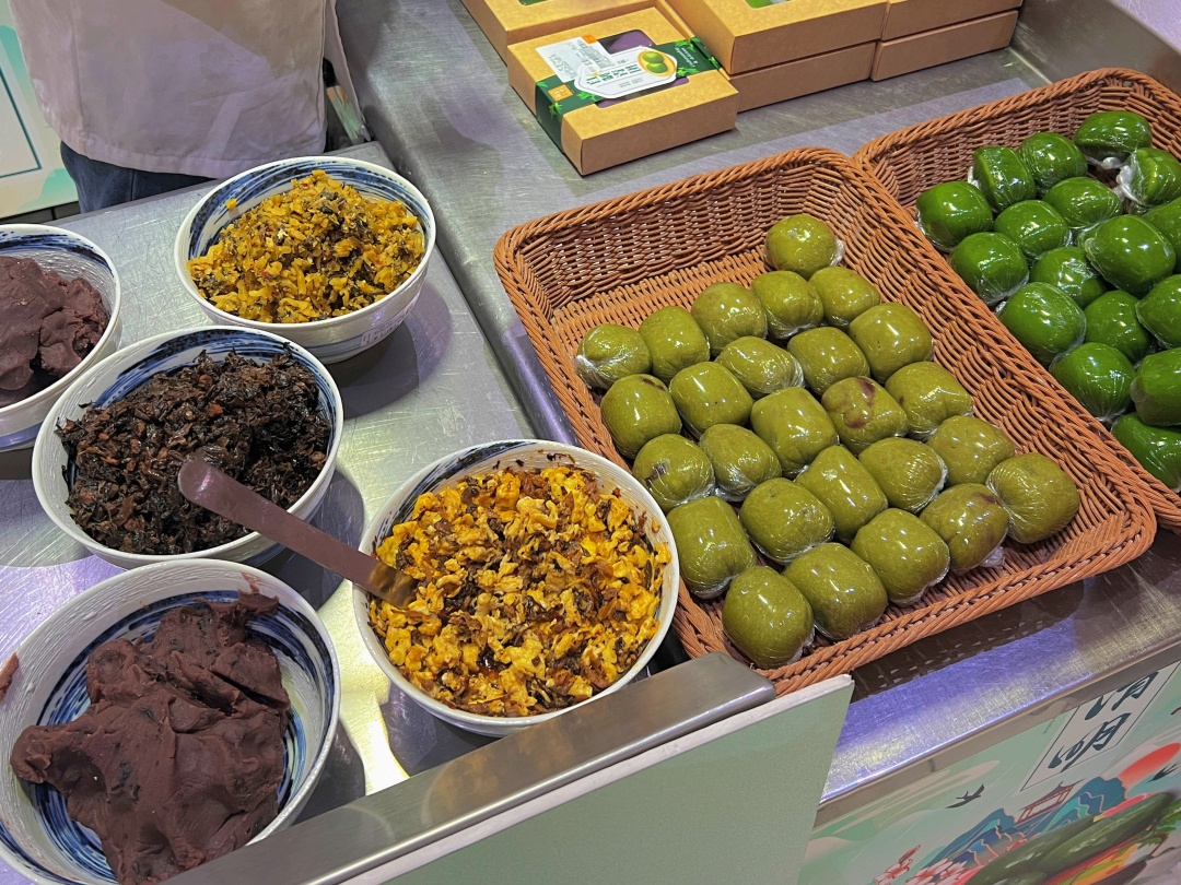 创新口味的青团可不止西梅豆沙这一种,更有酸菜笋丁馅和外婆菜鸡蛋馅,也吸引了不少顾客上前驻足询问。家住附近的刘女士今天就买了四只咸口青团,准备回家尝尝鲜。“传统口味吃腻了,想试试这些新口味。先买几只自己吃,好吃的话就再来给父母买一些,让他们也‘创新’一下。”刘女士笑着说。