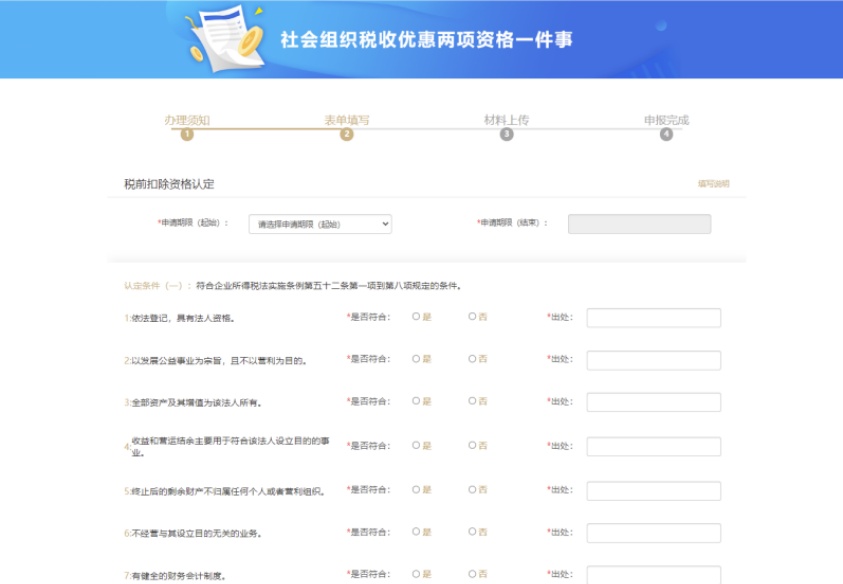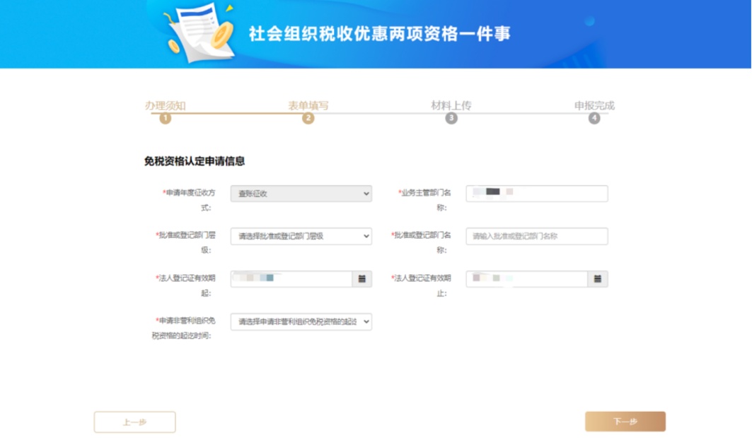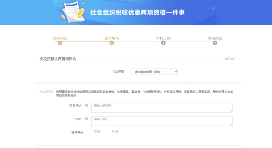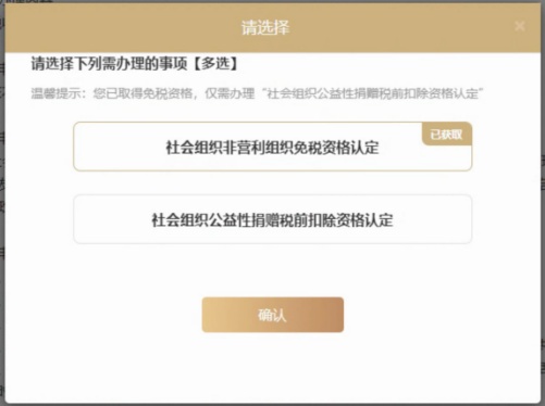 免税资格为自动校验,若已有免税资格,则无需办理社会组织非营利免税资格认定,仅需选择社会组织公益性捐赠税前扣除资格认定进行办理;若无免税资格,则必须勾选社会组织非营利免税资格认定。选择需办理事项后点击【确认】,进入表单填写页面。