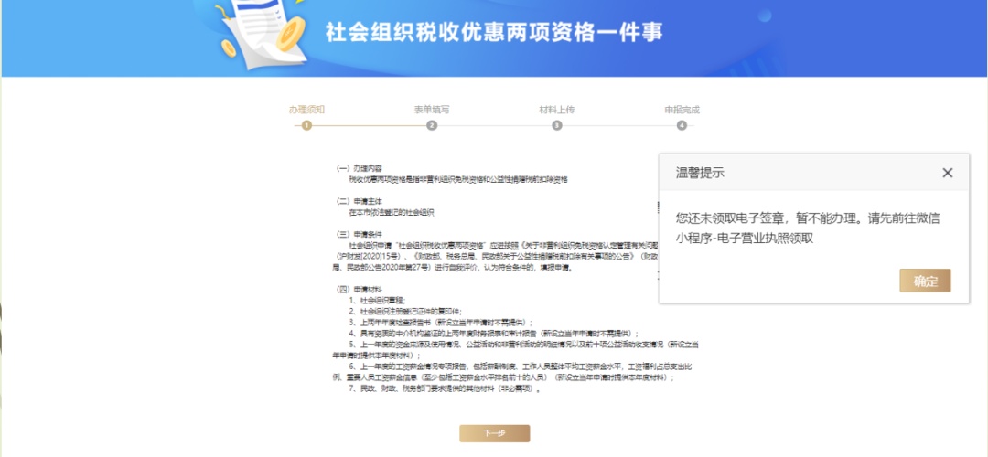 注意事项:需要电子签章。点击【下一步】会有提示“您还未领取电子签章,暂不能办理,请先前往微信小程序-电子营业执照领取”。