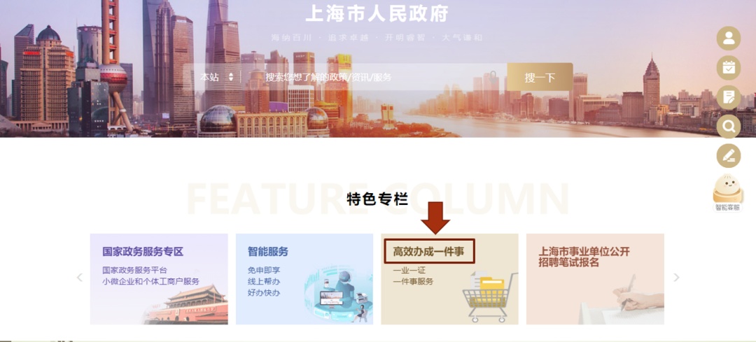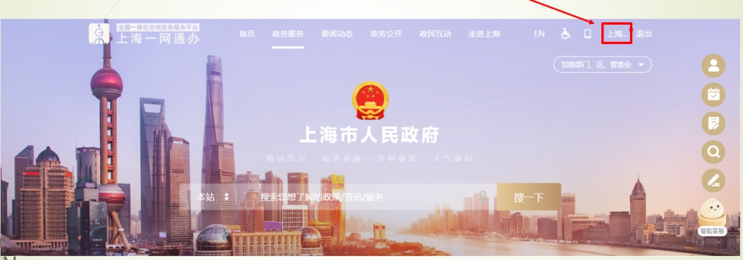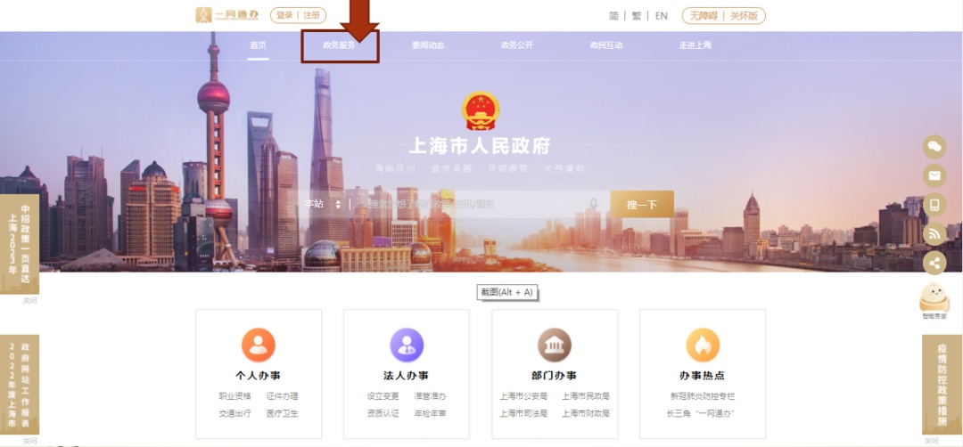 进入“一网通办”首页,地址为:https://sh.gov.cn
