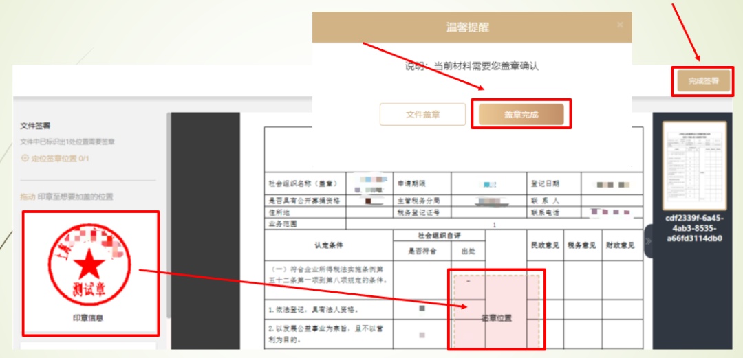 申请表盖章:根据填写的【基本信息】、【免税资格认定申请信息】、【免税资格认定自我评价】、【税前扣除资格认定】,自动生成《上海市公益性税前扣除资格申报认定表》、《非营利组织免税资格认定申请表》、《非营利组织免税资格自我评价情况表》,点击【前往盖章】、【文件盖章】,对生成的申请表加盖电子签章。