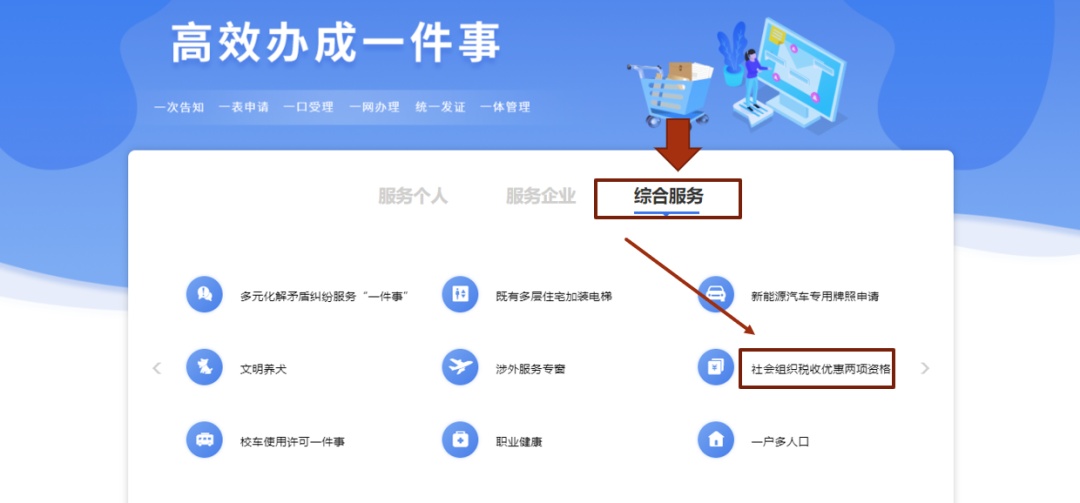 在特色专栏栏目依次选择【高效办成一件事】、【综合服务】、【社会组织税收优惠两项资格】,使用法人一证通或电子营业执照进行登录。