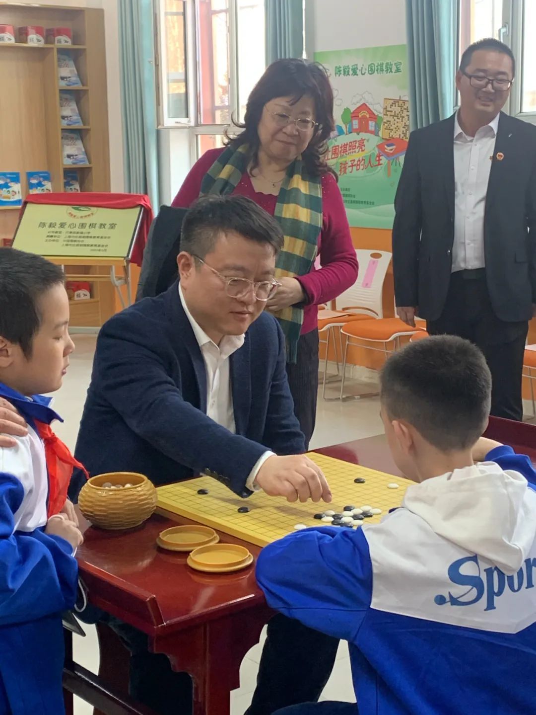 上海市体育局党组书记、局长徐彬与当地小棋手对弈