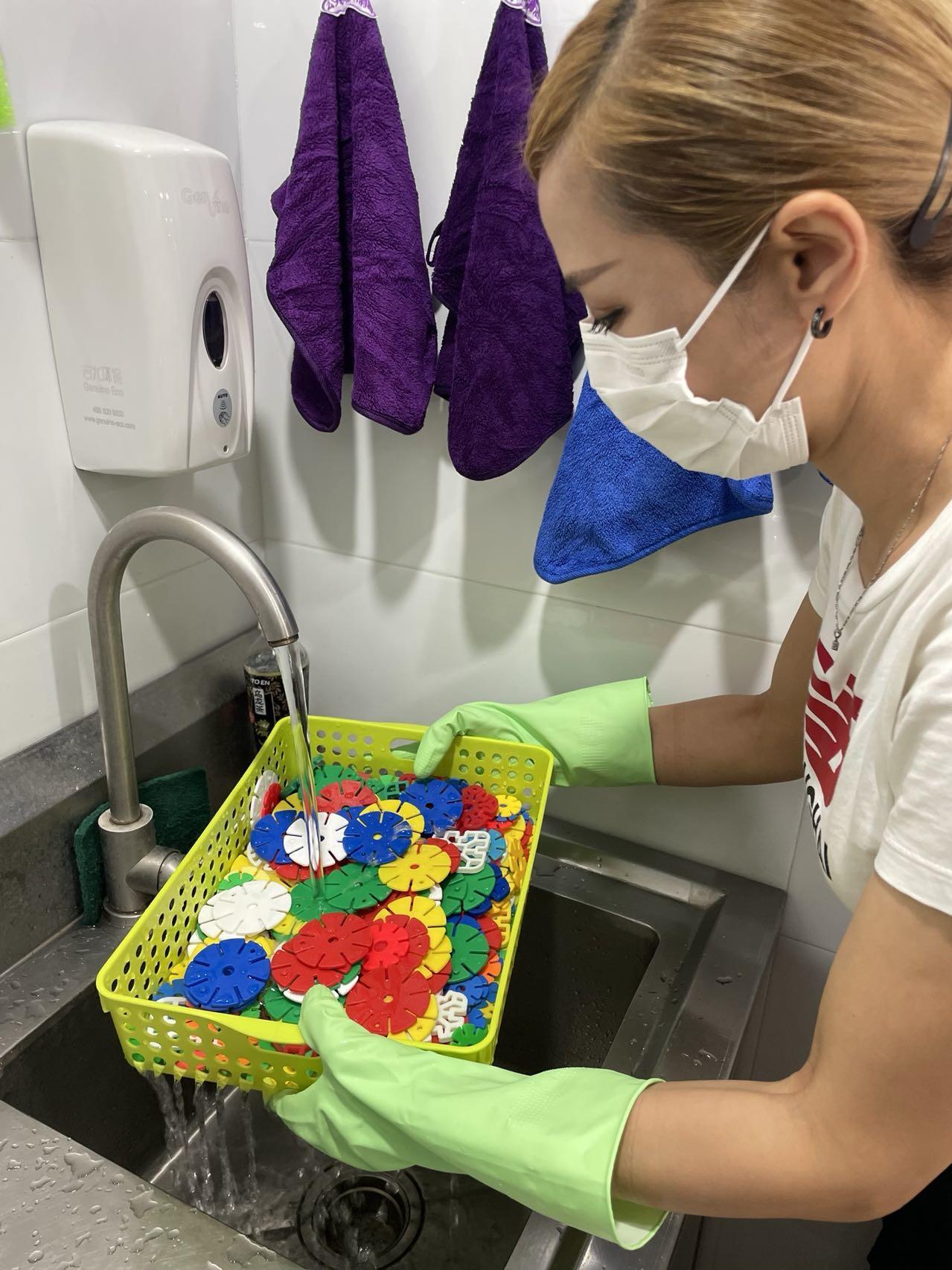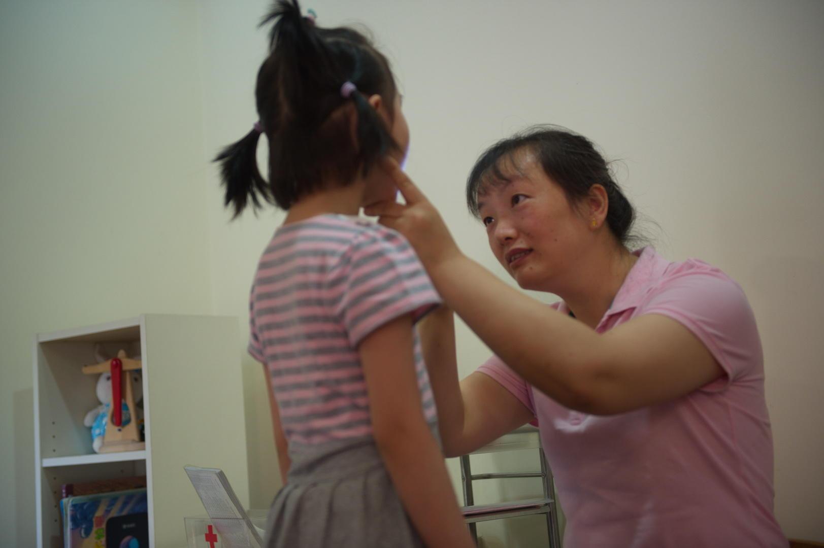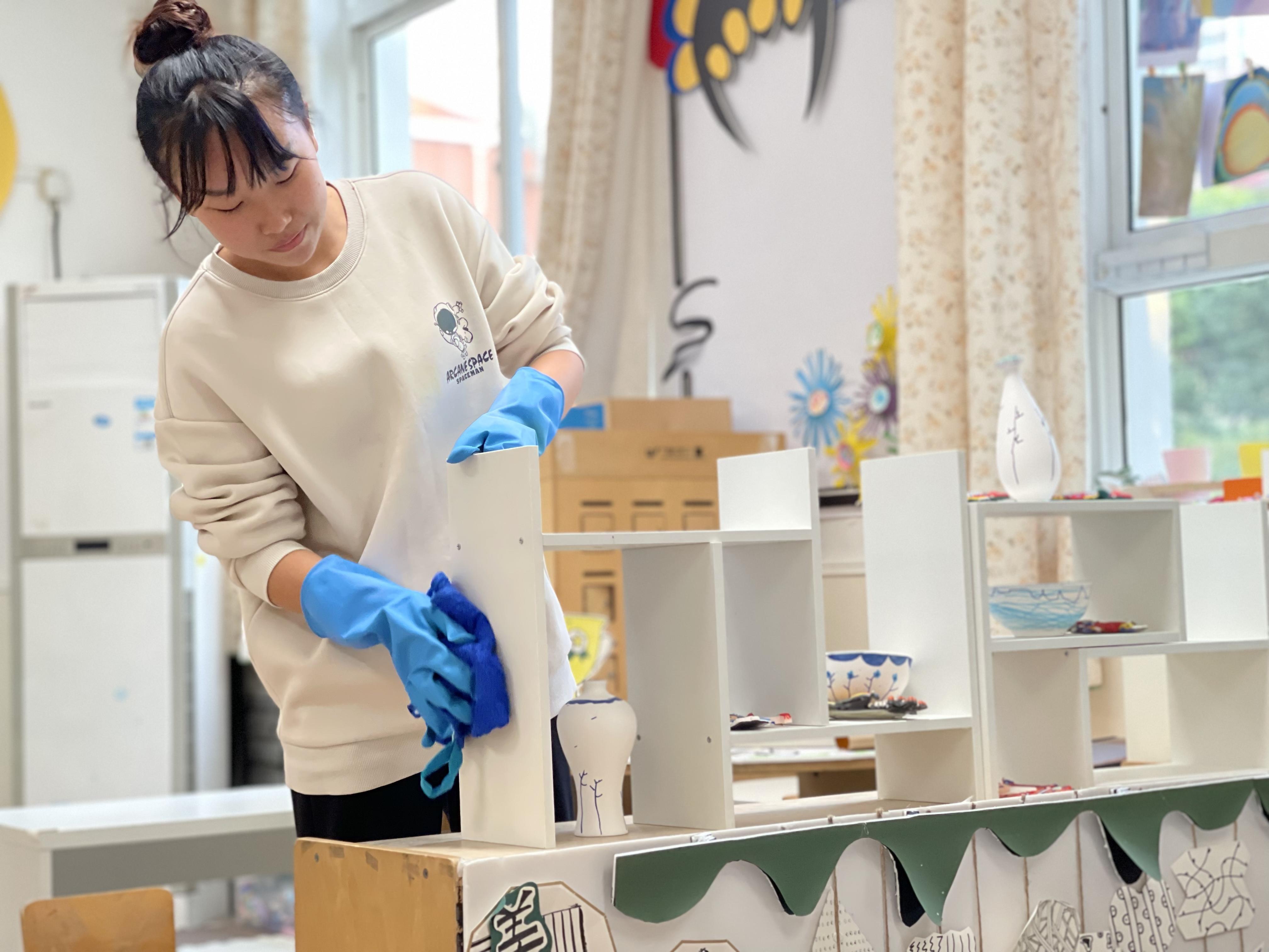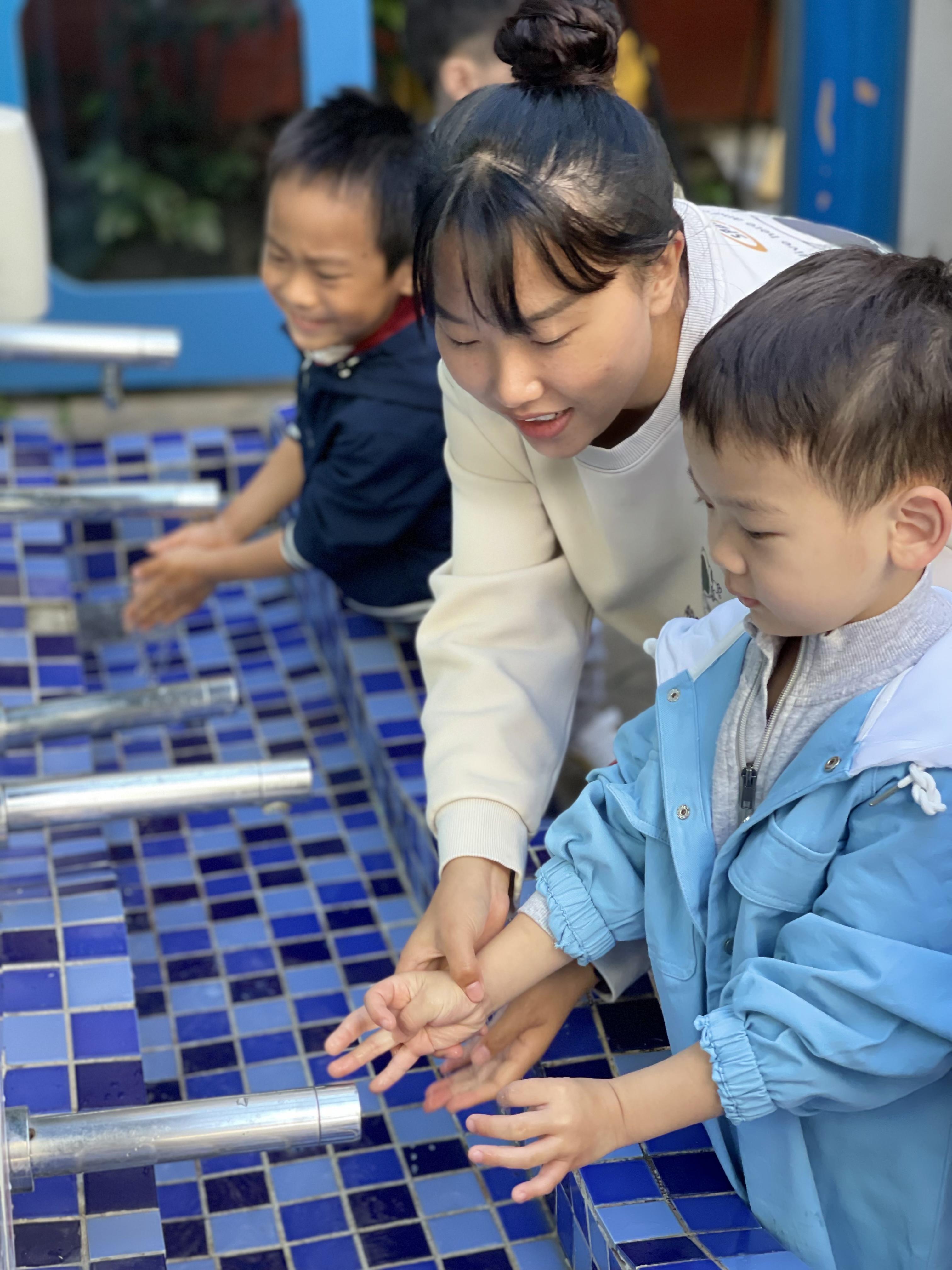 有一次,当她在护理孩子们午餐时,班级里的童宝说道:“扣子老师,我吃不下,我想吐……”“扣子老师”摸了摸孩子的额头,发现没有发烧,正在思考如何鼓励孩子再多吃两口的时候,“哇”地一声,童宝吐了“扣子老师”一身。看着童宝苍白的小脸,“扣子老师”顾不上擦自己的脸,用纸巾轻轻地先帮童宝擦干净脸上和手上的呕吐物,安慰她不要害怕,再拿起班级里的干毛巾覆盖在呕吐物上。当“扣子老师”完成消毒工作后,这才发现,浑身散发着刺鼻气味的自己有点狼狈。“此时的童宝已经在老师的帮助下喝水、漱口,情绪逐渐稳定了下来。这一刻,我也真的做到了‘不怕脏,不怕累’。”