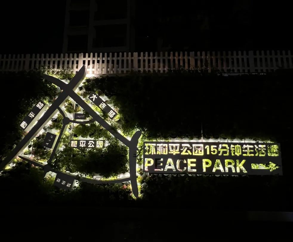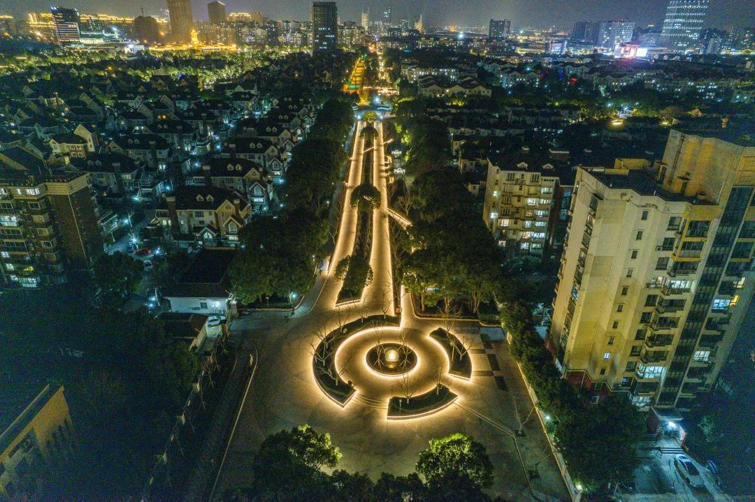 虹口区嘉兴街道畅心园是整个嘉兴街道灯光项目的设计重点,以线光来勾勒景观环境的主要结构,用面光来烘托部分树木和景墙,使整体景观在夜晚也能表达出如白天一般的环境语言。