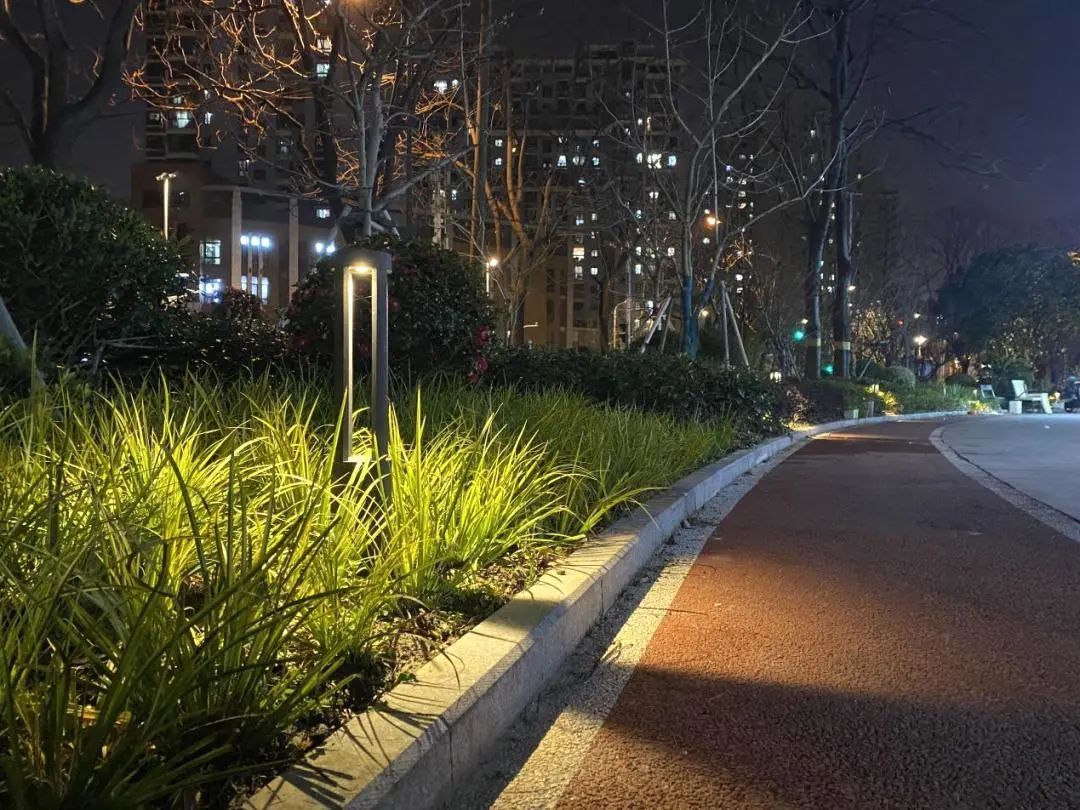 街区内沿着蜿蜒的漫步道,分布了明亮的绿地灯光,宛若指引都市夜归人返家的使者,细心地照亮着人们脚下的每一米道路,灯光柔而不隐,雅而不争,恰到好处的与绿地里的植物相辅相成,让夜晚的植物们更加灵动起来。