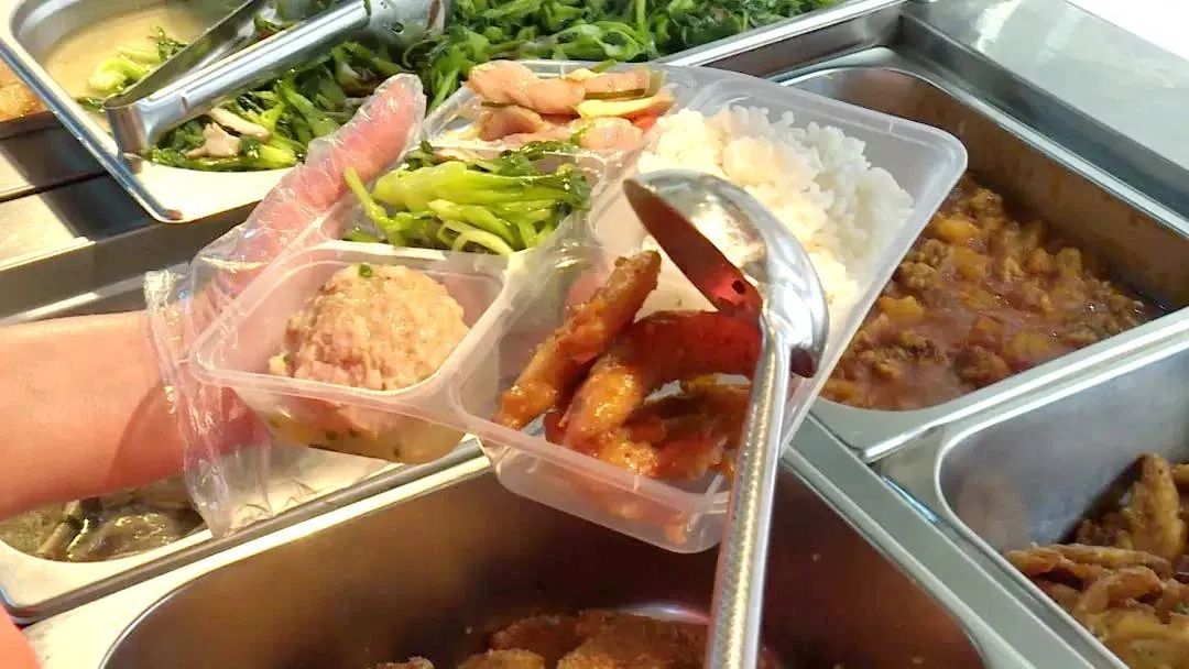 有的居民堂食完还会打包两份菜带回家。打包盒5毛钱一个,但食堂工作人员更建议居民自己带饭盒来打包,工作人员在打菜时都是舀满满三勺,盛出来的每盘菜分量十足,排队的居民都说量大实惠。