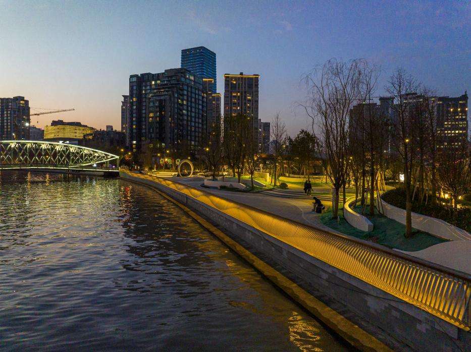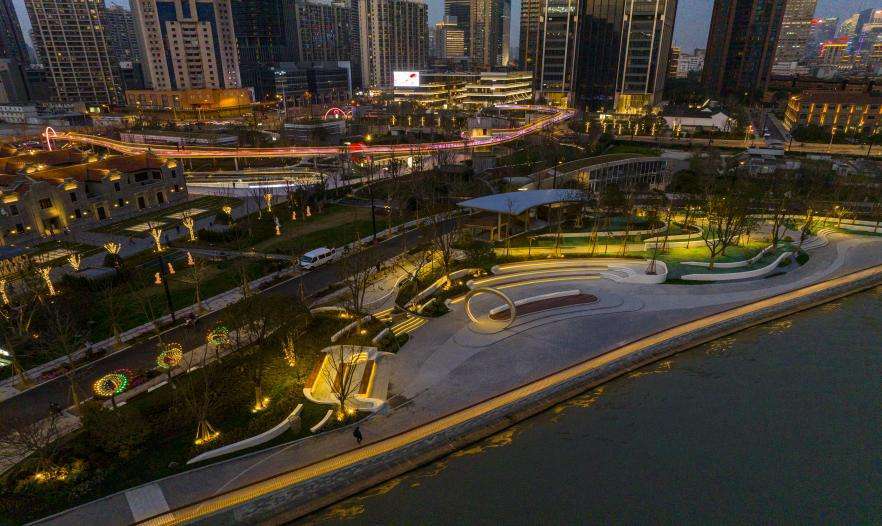夜间打造曲线灯光图案透光景墙,结合灯光投影配合四大景观主题区域,重现苏州河“沪上清明上河图”的意境。因地制宜设置一处苏河驿站。