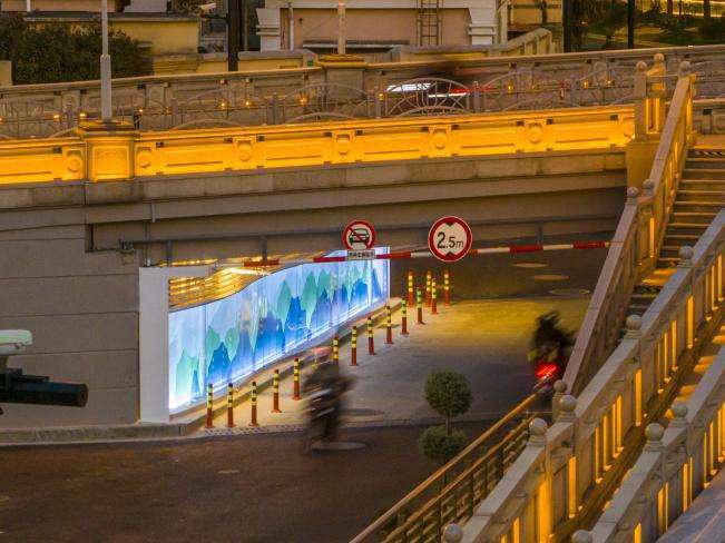 值得一提的是,在景观提升的过程中,还同步提升福建路桥下空间景观,以“时代浪潮”为主题,用格栅和玻璃灯箱装饰,提亮原有灰色调的桥下空间,打造具有视觉流动感及新老相呼应的桥下新空间。