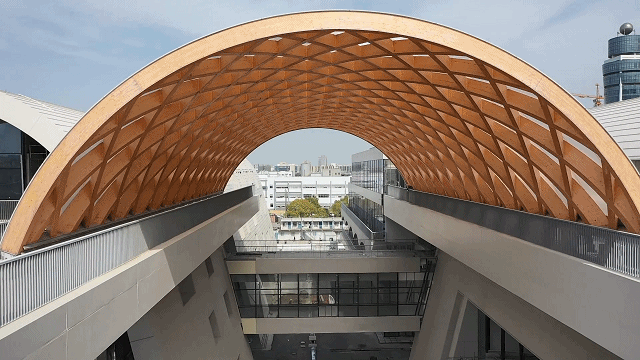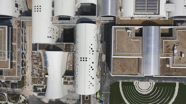 在东方美谷大道、环城东路路口,从空中俯瞰“海之花”,建筑主体采用拱结构作为主要覆盖方式,所有的建筑单体通过拱顶之间的交错形成拱桥连绵的总体意向,串联起各场馆的空间和活动,传递具有奉贤地方文化标识的水乡意蕴,也营造出一种让奉贤市民感到亲近的乡土氛围。