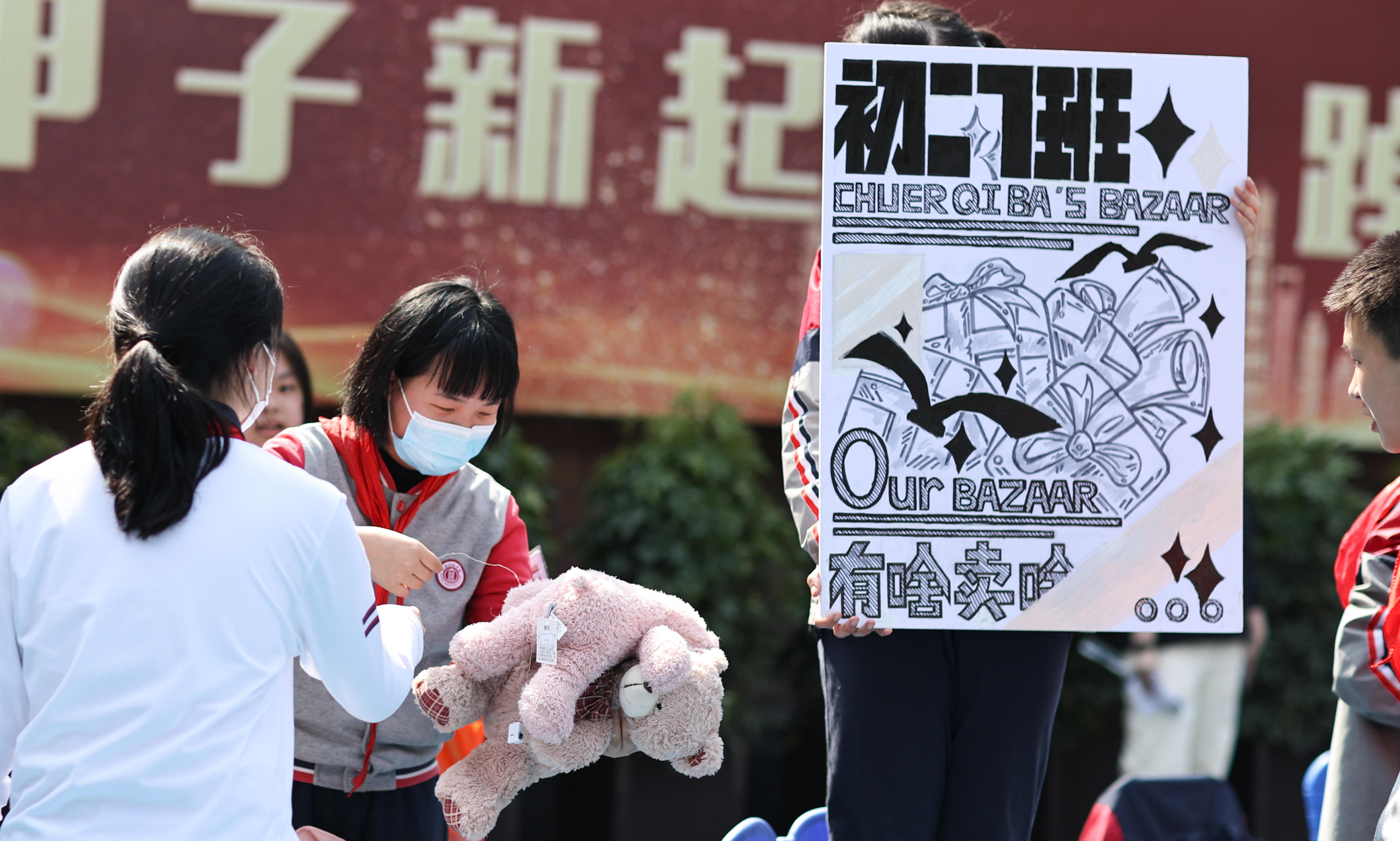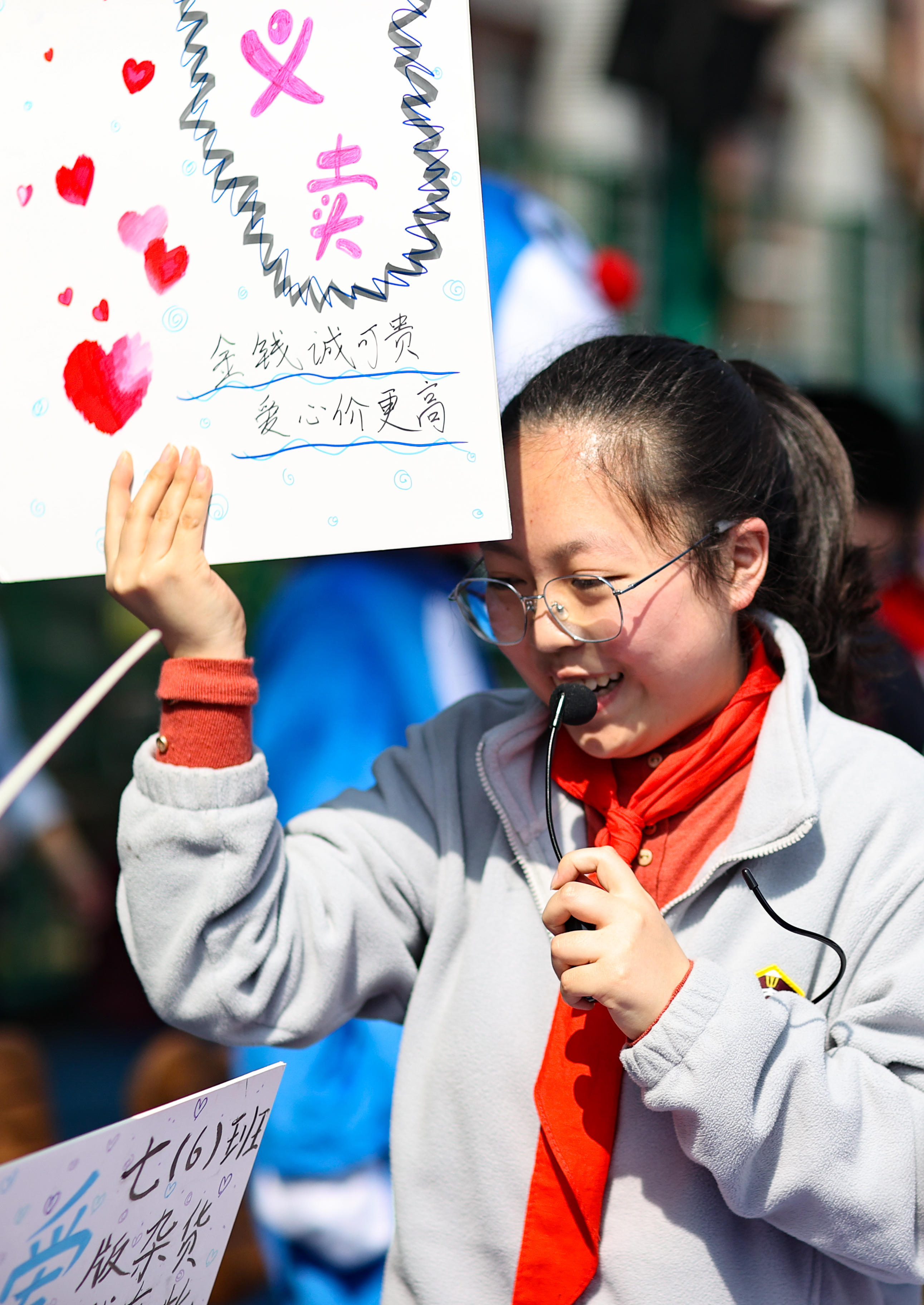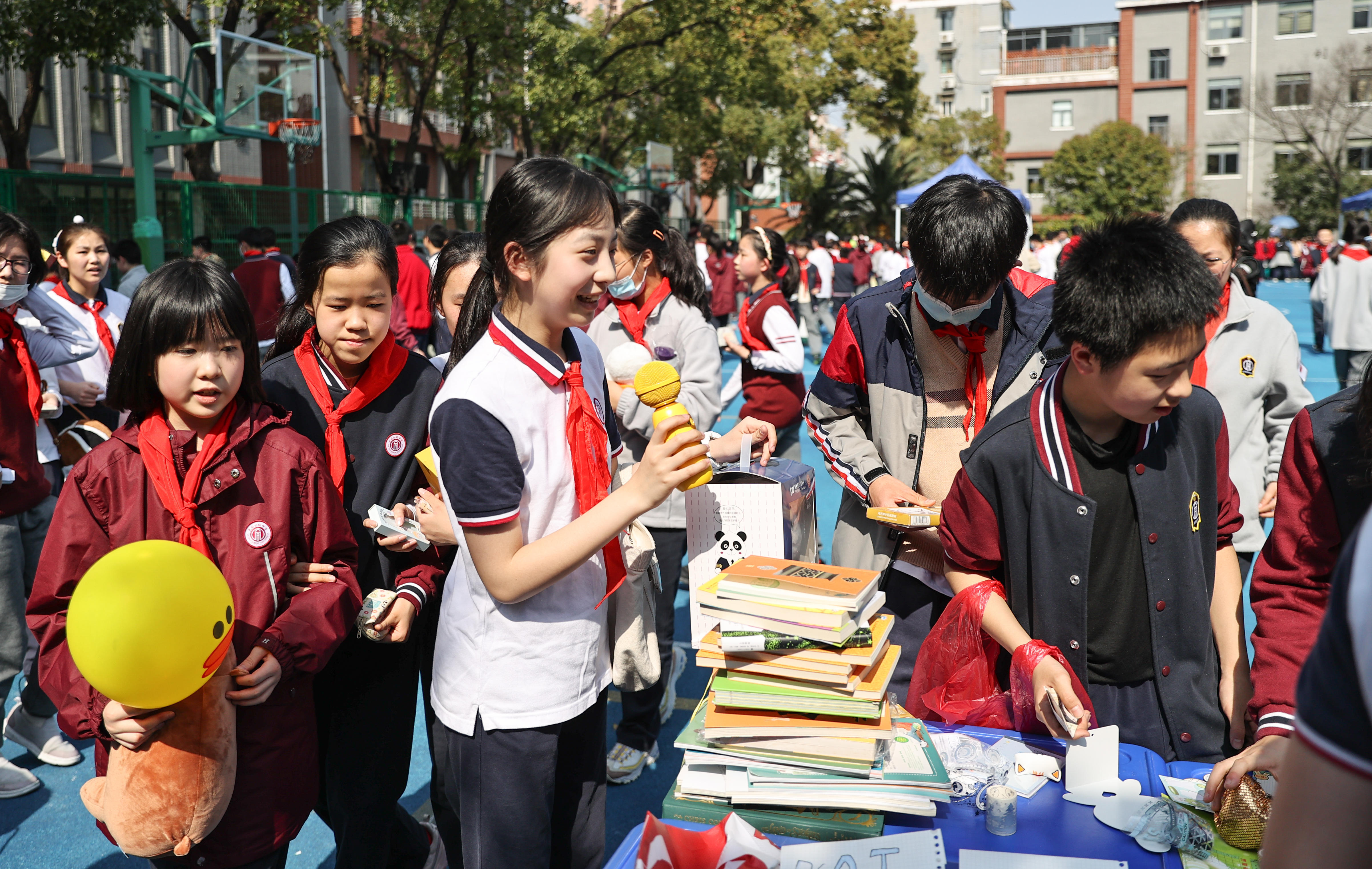 义卖活动现场气氛热烈,有的中队采用了抽奖机制,吸引了一大批顾客;有的中队DIY学校文创产品,大受欢迎,一时间一抢而空;老师们也尽力叫卖,各年级组的展台门庭若市……