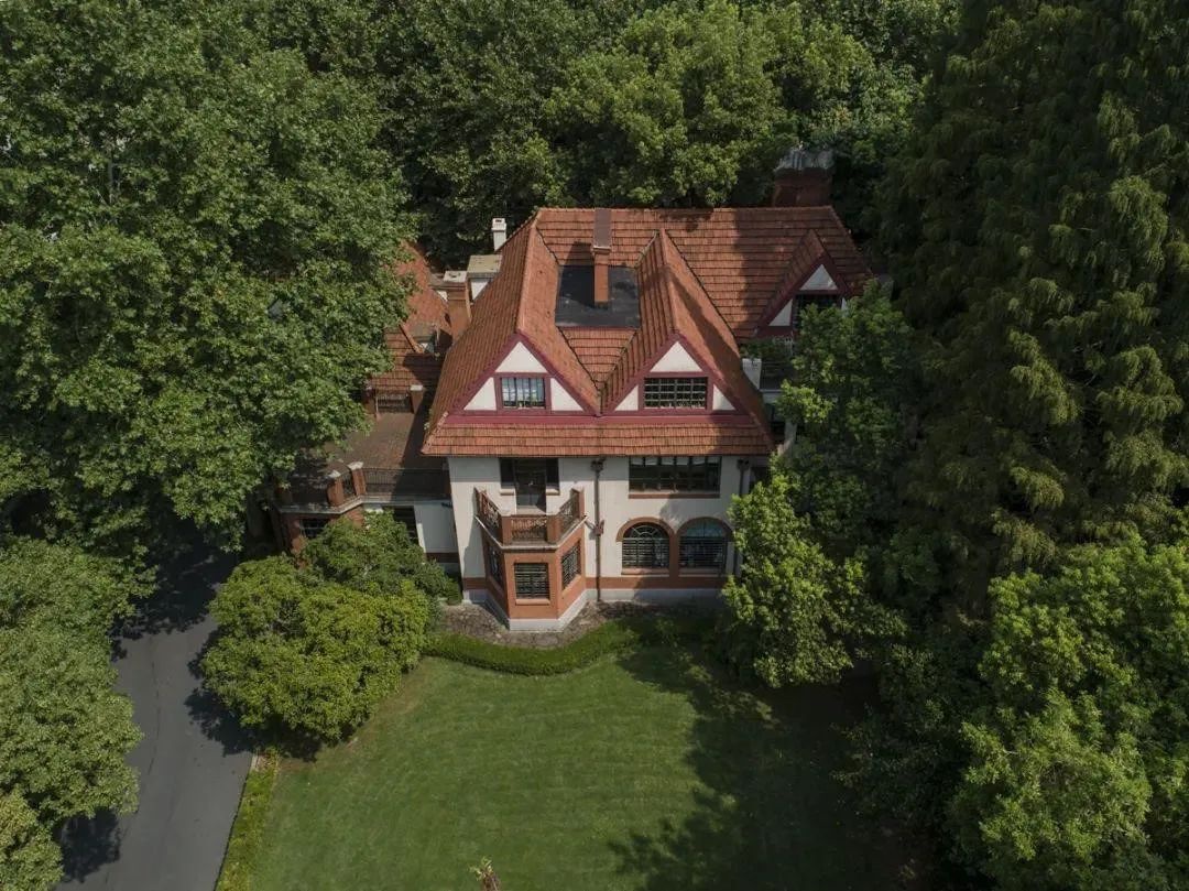 辟筑于1914年的复兴西路浓缩了上海的浪漫情怀,两旁梧桐交相掩映,稀释了紧张的城市节奏与市井喧嚣。沿途多为花园住宅和西式高层公寓,建筑以装饰艺术风格为主。其中,一幢英式乡村风格别墅十分引人注目。